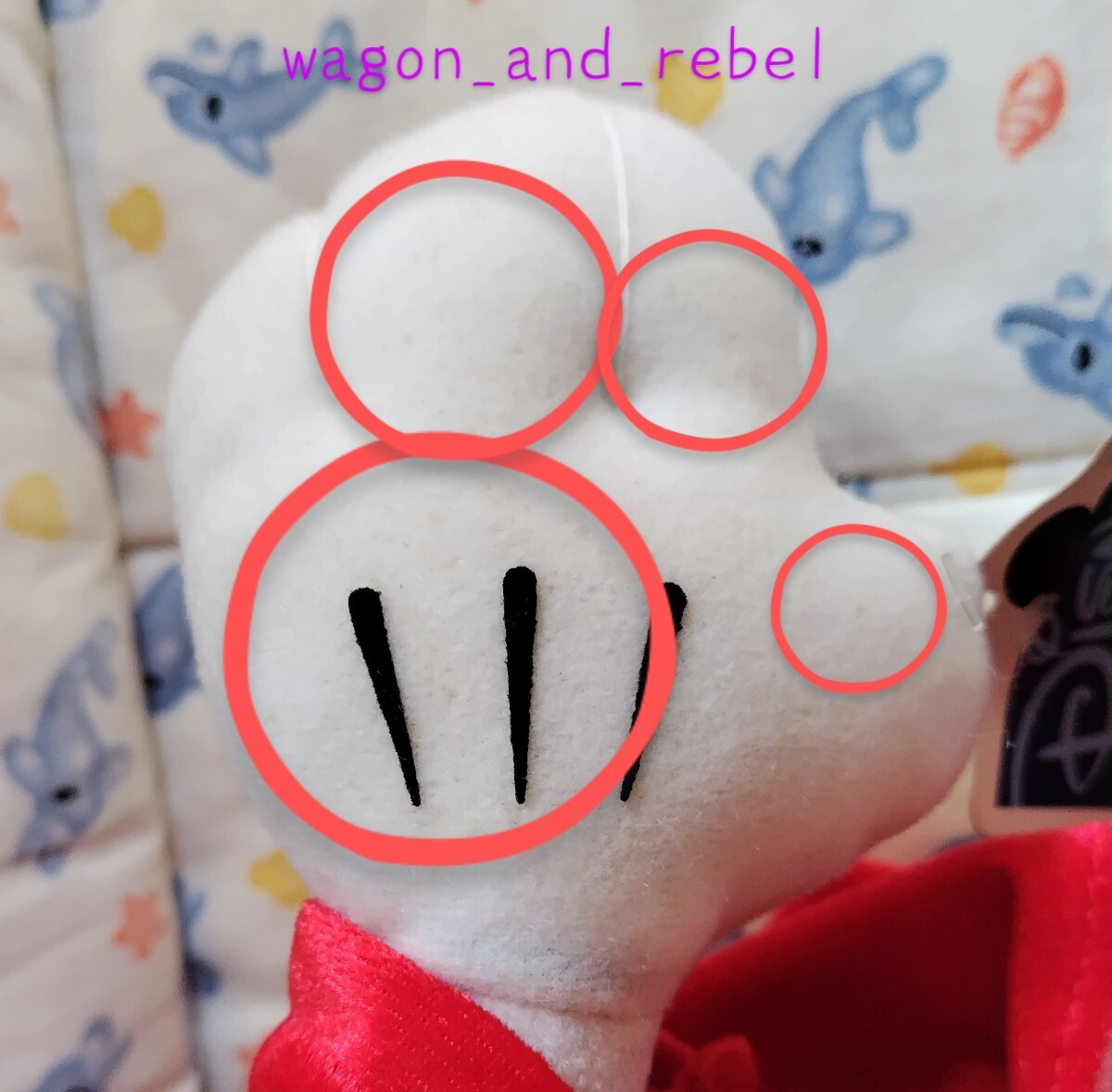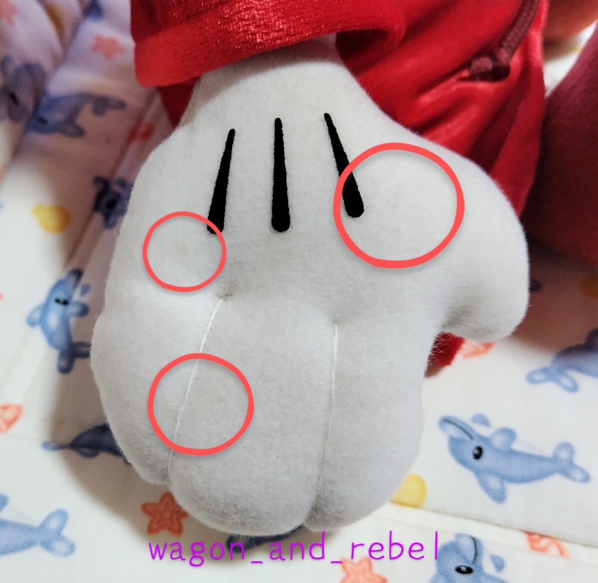 暗所にてしまってあったものですが、経年劣化の為か細かな汚れがあり、特に手袋をはめたお手々の汚れが酷いです(画像9・10参照)。