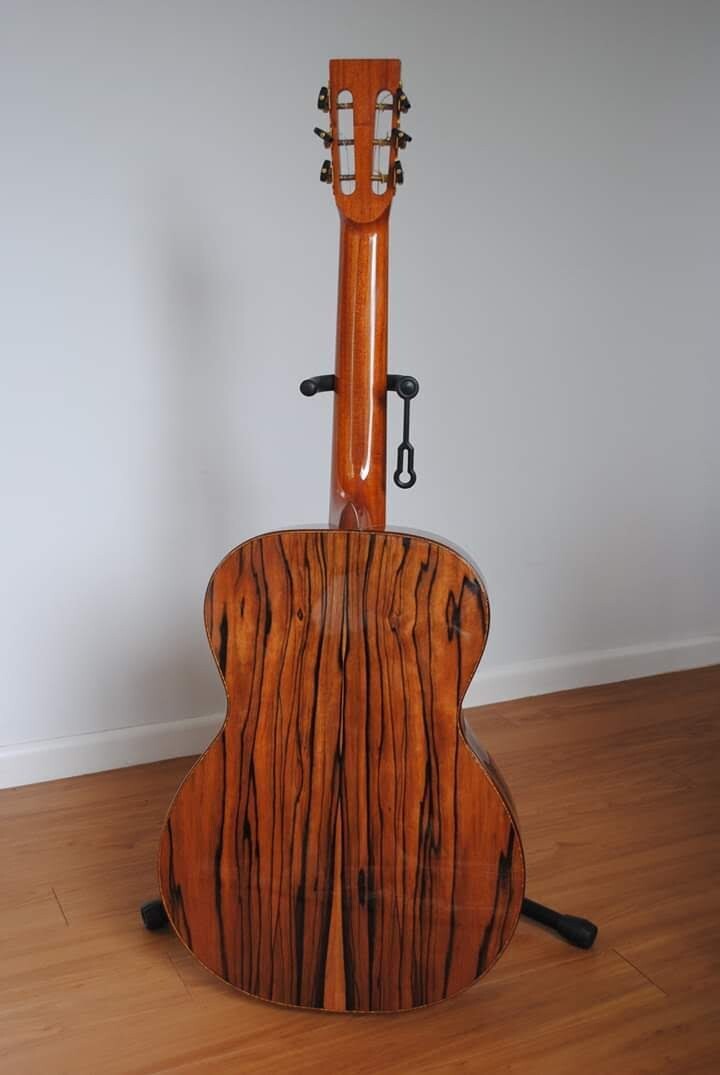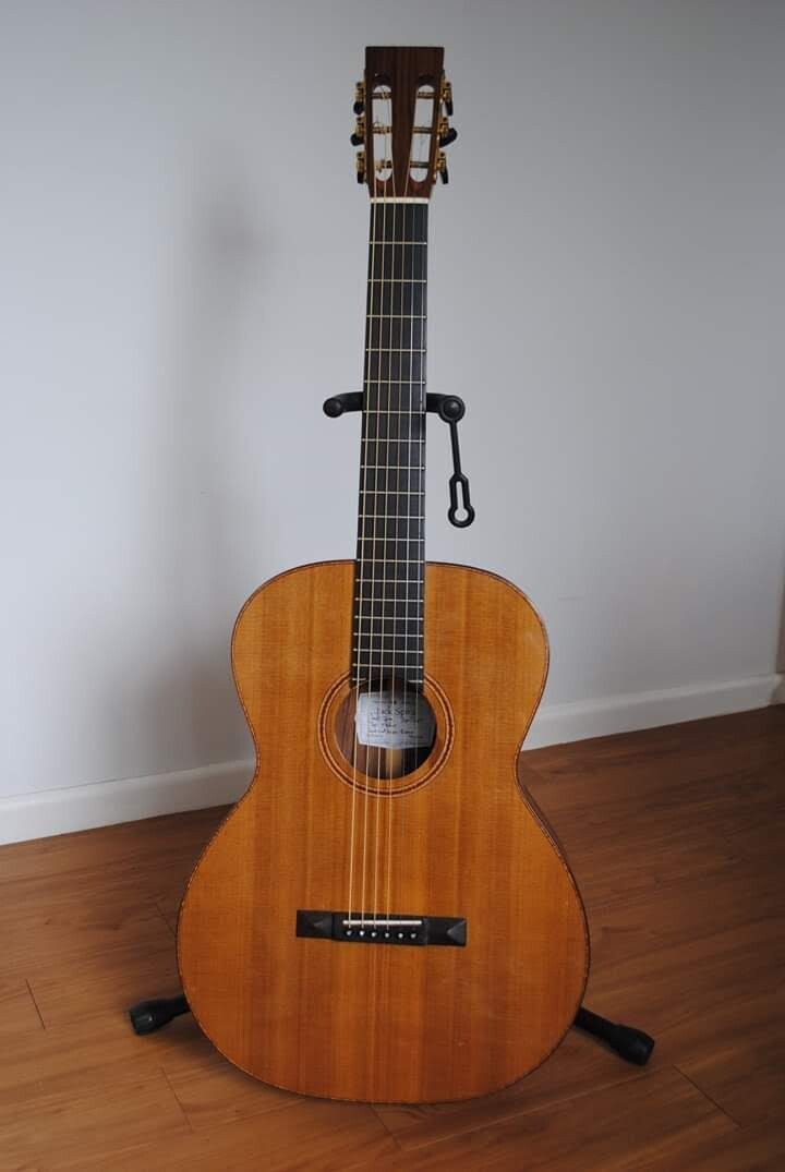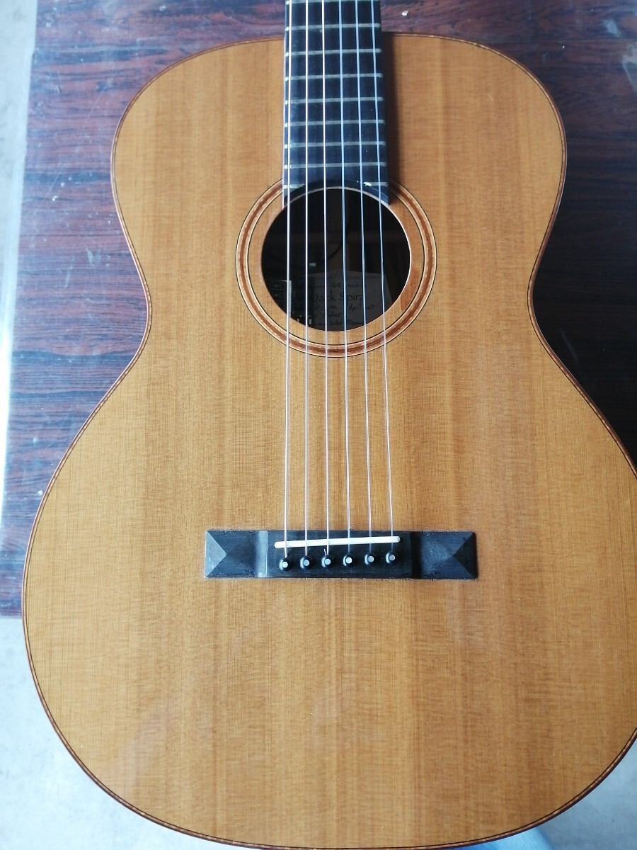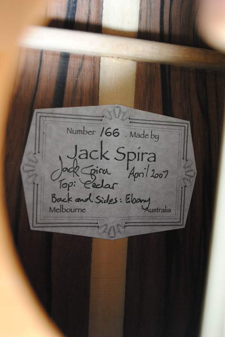 2007年製のシダートップ、エキゾチックな木目のニューギニアエボニーのサイドバックのオーダーカスタム品です。無理を言ってヘッド裏に焼印を入れてもらいました。現在はジャックスピラは12Fジョイントのクラシックギタータイプのアコギのオーダーは受け付けてません。写真ではガット弦を付けてますが現在はマーチンのSP弦を付けてます。ピックアップを付けてましたが現在は外しております。年代の割には比較的美品と思います。非純正のハードケースに入れて発送予定です。