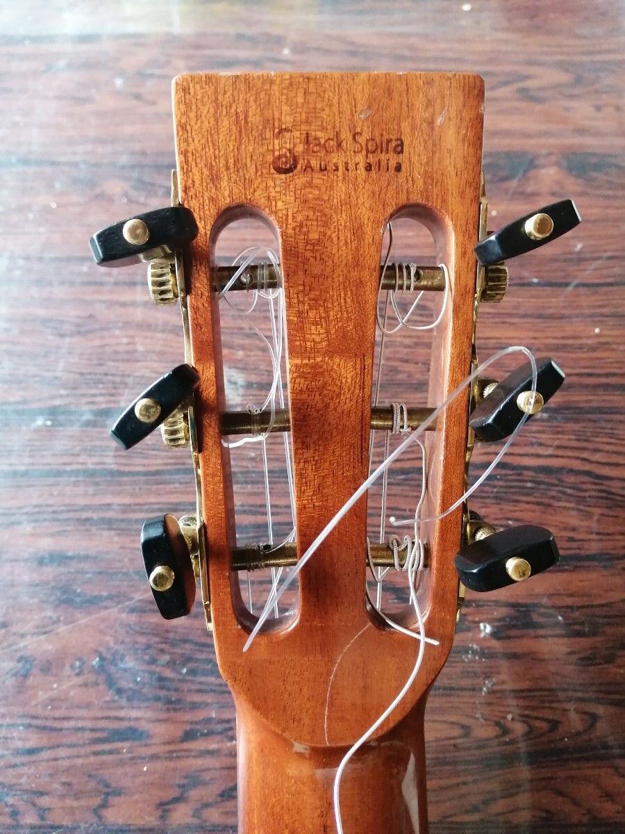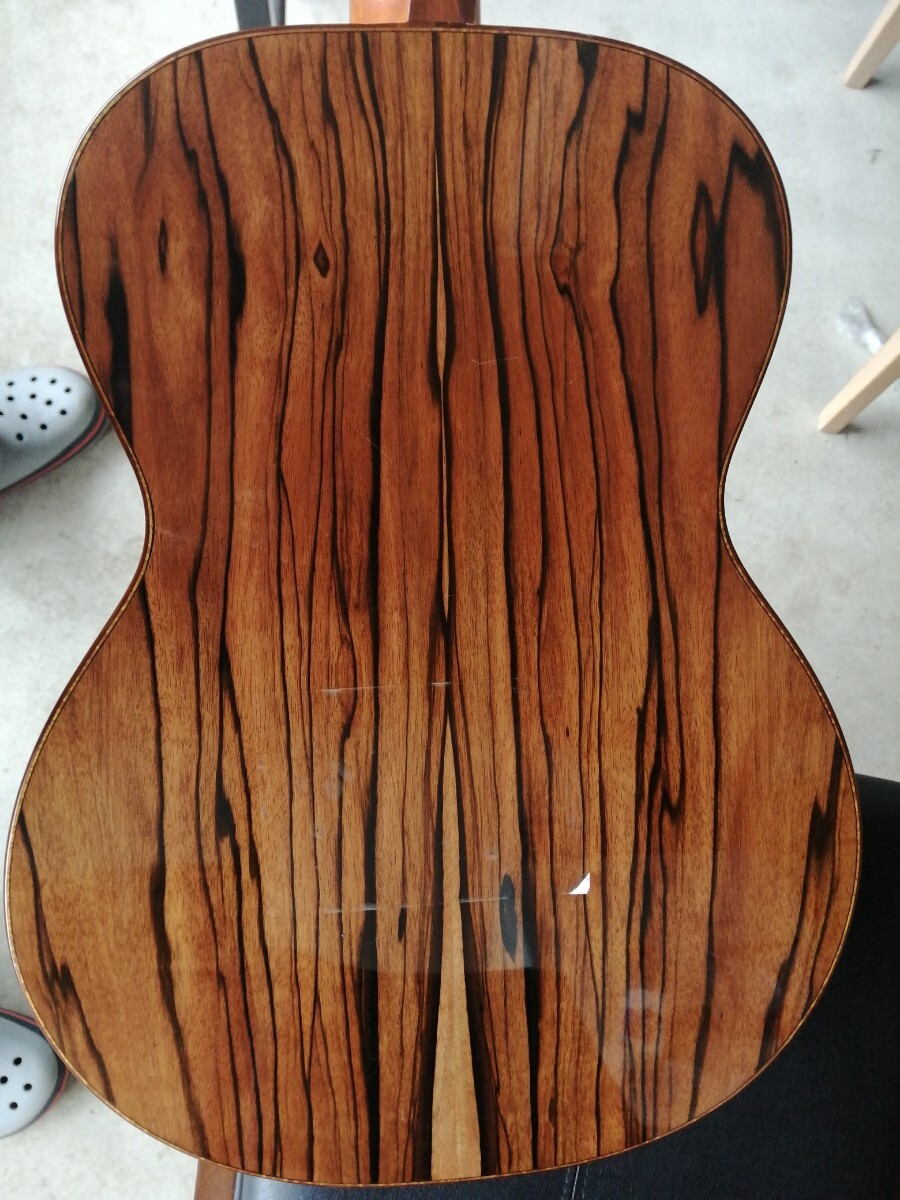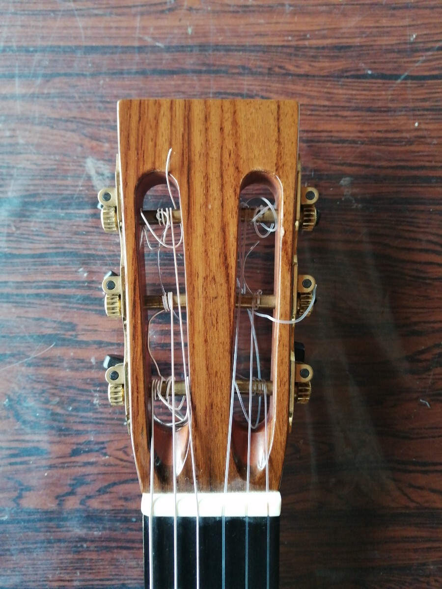 2007年製のシダートップ、エキゾチックな木目のニューギニアエボニーのサイドバックのオーダーカスタム品です。無理を言ってヘッド裏に焼印を入れてもらいました。現在はジャックスピラは12Fジョイントのクラシックギタータイプのアコギのオーダーは受け付けてません。写真ではガット弦を付けてますが現在はマーチンのSP弦を付けてます。ピックアップを付けてましたが現在は外しております。年代の割には比較的美品と思います。非純正のハードケースに入れて発送予定です。
