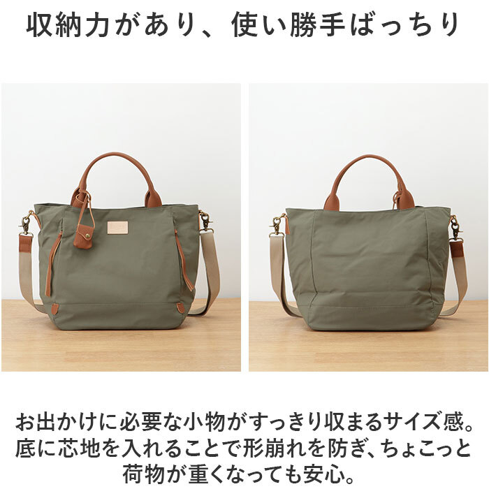 商品説明 | ・・大人の女性にぴったり♪デザイン性も使い勝手もばっちりな「toleur ナイロングログラン2WAYトート」が新登場。 ・【レザー使いがおしゃれ】 ・ハンドルや取り外し可能なミニポーチチャーム、引き手には自然な風合いの牛革を使用。カジュアルな中に、上品さをプラス。 ・【収納力があり、使い勝手ばっちり】 ・お出かけに必要な小物がすっきり収まるサイズ感。底に芯地を入れることで形崩れを防ぎ、ちょこっと荷物が重くなっても安心。 ・【持ち方を選べる2wayタイプ】 ・手持ちではもちろん!長さ調節可能なショルダーベルトを取り付けて、斜め掛けや肩掛けも。シーンやお好みに合わせてスタイルチェンジ。 ・【マグネットでワンタッチ開閉】 ・開口部はマグネット式で、簡単オープン!中身の飛び出しもガード。 ・【うれしいA4対応サイズ】 ・内側はA4サイズのファイルが、横向きにすっぽり。マチもあり、ペットボトルやコスメポーチ、お弁当箱なども収納可能。 ・【サッと取り出せるポケット】 ・内側と外側に合わせて5つのポケットを配置しており、小物が迷子になりにくい!正面からはポケットが見えないという”さりげなさ”もポイント。 ・【シーンを選ばず活躍】 ・お出かけや通勤、旅行などでも重宝。ちょっとおしゃれなマザーズバッグとしてもおすすめ。 ・【お気に入りをチョイス】 ・コーデに取り入れやすい、落ち着きのあるカラーをラインナップ。不織布素材の収納袋付き。 ・【toleur-トーラ-】 ・沢山の人にレザーを使ったバッグを持ってもらいたいという願いを込め、フランス語をもとに名づけたブランド。レザーを使い、ナチュラル感と使いやすさを兼ね備えた仕上がり。 ・【ポケット仕様】 ・内側:ファスナーポケット×1、オープンポケット×2 ・前面:ファスナーポケット×2 |