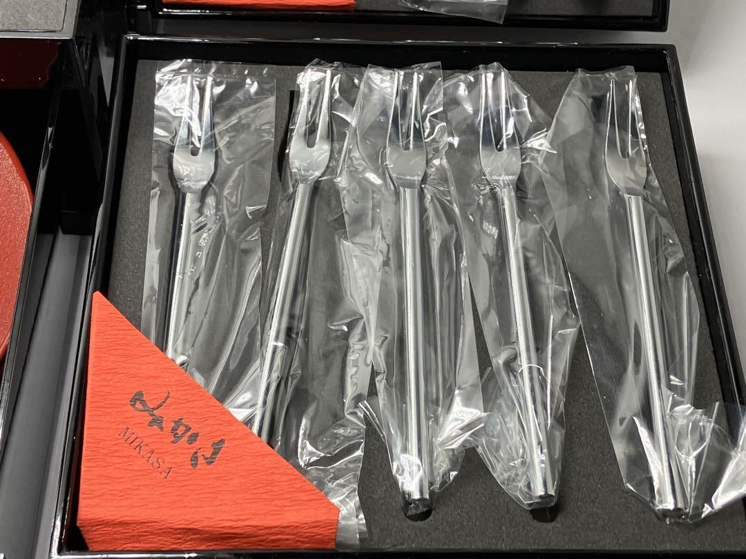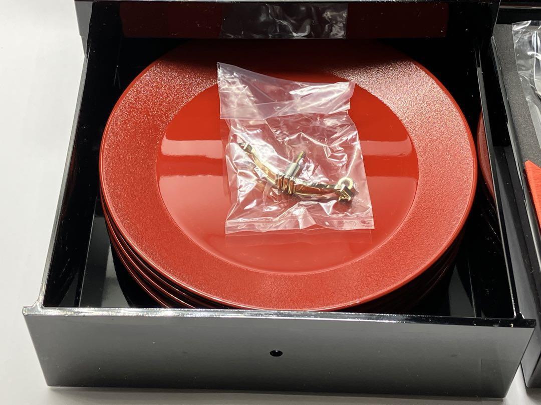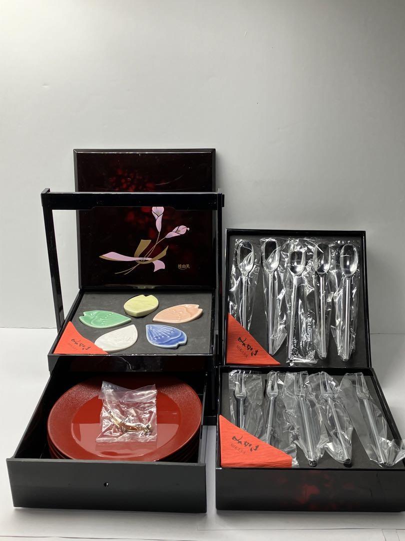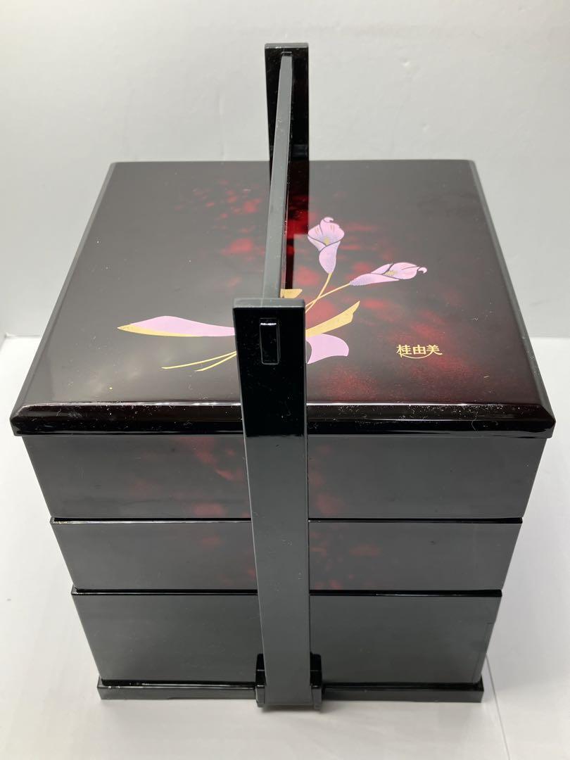 桂由美 重箱 3段 花模様 小皿付き漆塗りの桂由美の3段重です。各重箱にはスプーンやフォーク、箸置きがセットされています。一番下は引き出しになっており、取り皿が5枚入っています。(引き出しの取手あり)内容物を取り出せば、お料理を詰められます。コンパクトで1-2人向けサイズです。- デザイン: 花の模様が施された黒い漆器- 構成 : 3段の重箱- サイズ : 縦横約15cm、高さ約20.5cm- 付属品 : 小皿5枚、箸置き5個、スプーン5本、フォーク5本- 箸置き: 葉の形をした陶器の箸置き(色:緑、黄色、ピンク、白、青)- ブランド名: 桂由美未使用品ですが、長期保管品のため箱にダメージがあります。