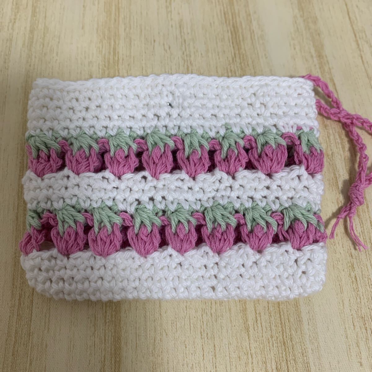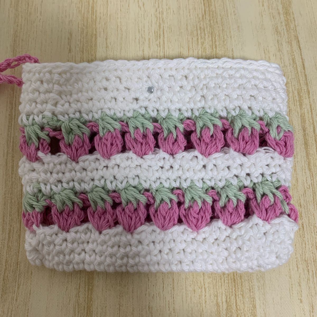 春 手作り 手編み かぎ針 かぎ針編み 夢 夢可愛い メルヘン 量産 量産型 ロリータ ポーチ 小物入れ ピンク ホワイト 白 グリーン 緑 カード カードケース いちご ストロベリー 苺 イチゴ パスケース ケース