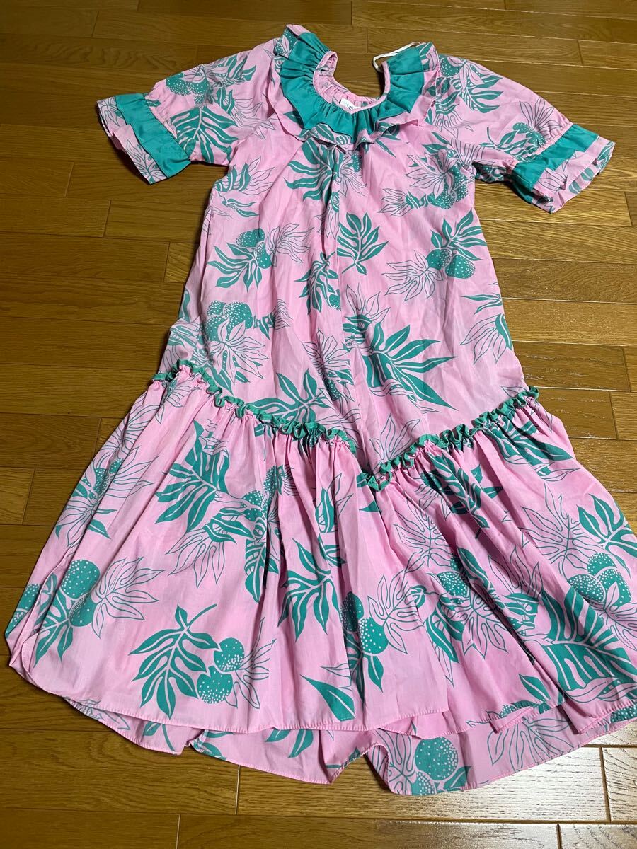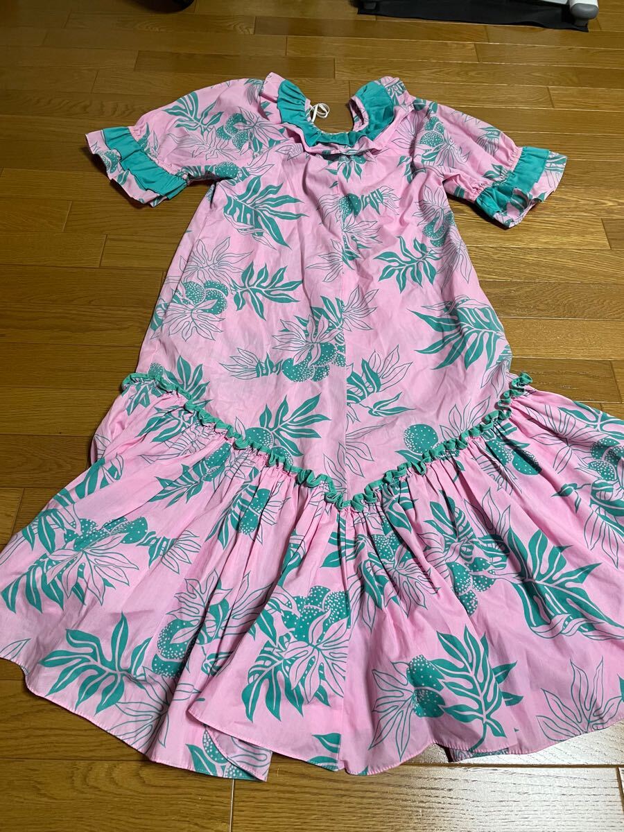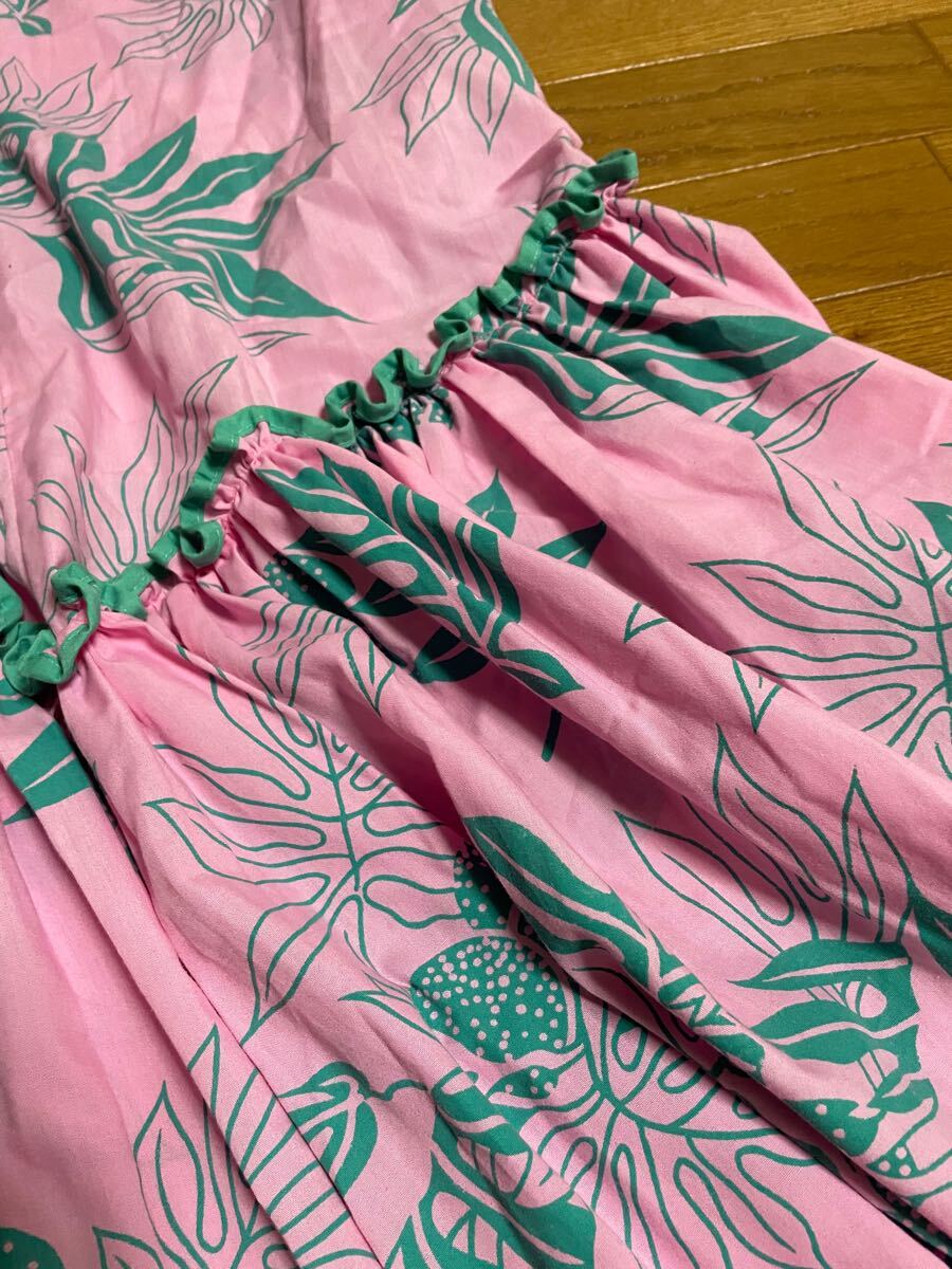 yen's Casual Fashion ハワイ ピンク×緑色 シダ、パンの身柄 7分袖 ムームー Mサイズ フラ、ウクレレ