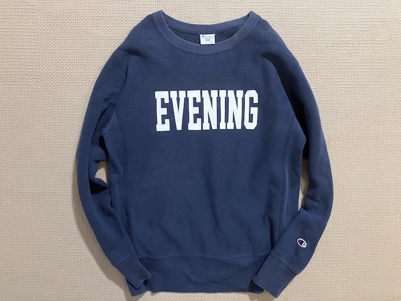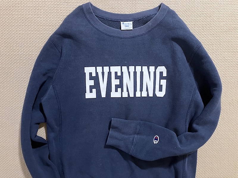「EVENING」と胸にラバープリントされていて、遊び心溢れるカレッジ風のシンプルな文字とフォントがポイントの人気の高いモデルです