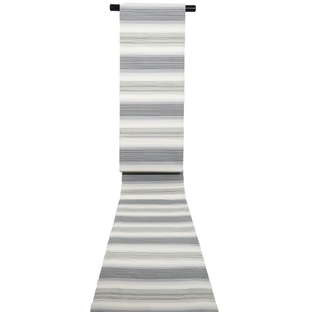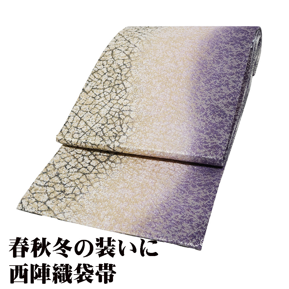 | 西陣織袋帯 金・銀・紫・緑地 地割れ模様・流水 全通 裏地:黒・白・グレー・緑地 横縞 未使用品 仕立て上がり | |