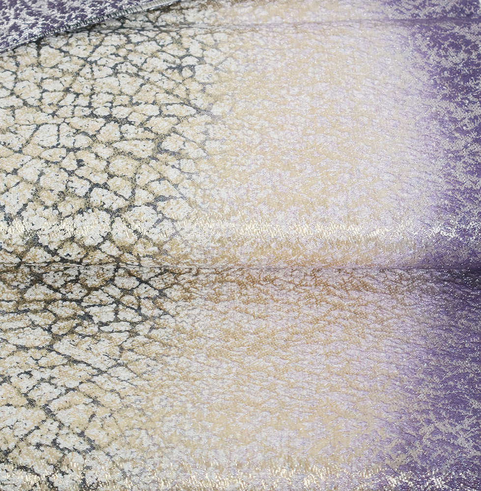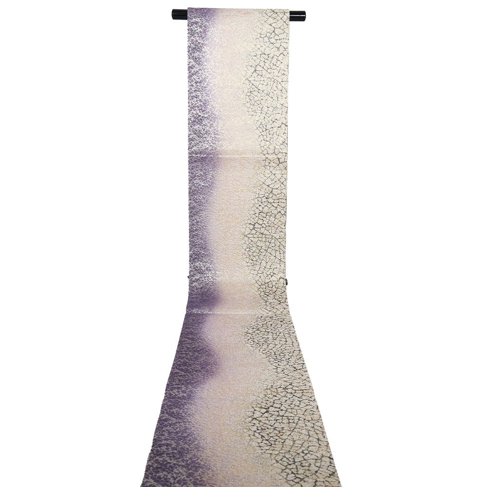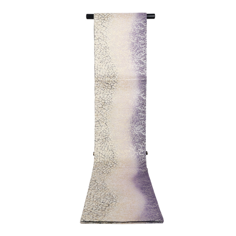| 色・柄 | 西陣織袋帯 金・銀・紫・緑地 地割れ模様・流水 全通 裏地:黒・白・グレー・緑地 横縞 (写真では上手く色が出ない場合があります。ご了承下さい) ※お使いのディスプレイの種類や設定の差により 実物の色と画像の色が少々異なることもございます。 |