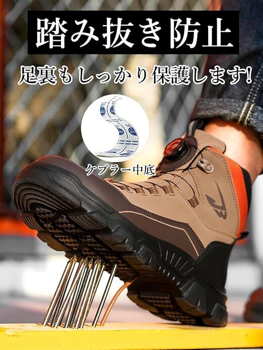 【踏み抜き防止機能】当社の靴は、1100Nの穿刺力にも耐えうるケブラー中底を採用しております。これにより、釘やガラスといった鋭利物を踏み抜く危険を回避し、足元の安全を確保し、足を怪我から守ることができます 。