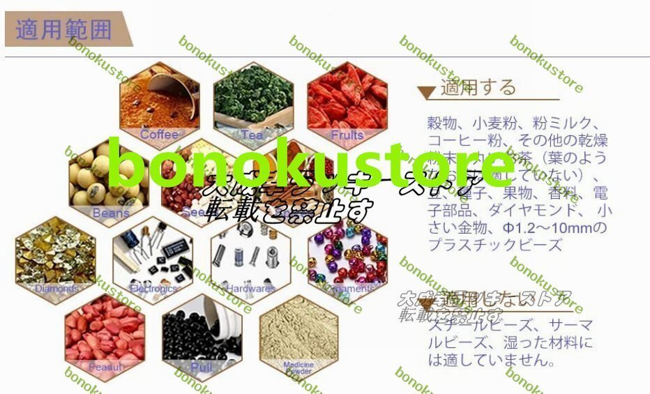 「適用範囲」コーヒー豆、穀物、種子、ダイヤモンド、丸薬、食塩、金物などに適用し、店舗から工場まで幅広くお使いいただけます。使用している素材が適切かどうかわからない場合は、販売者に確認してください。