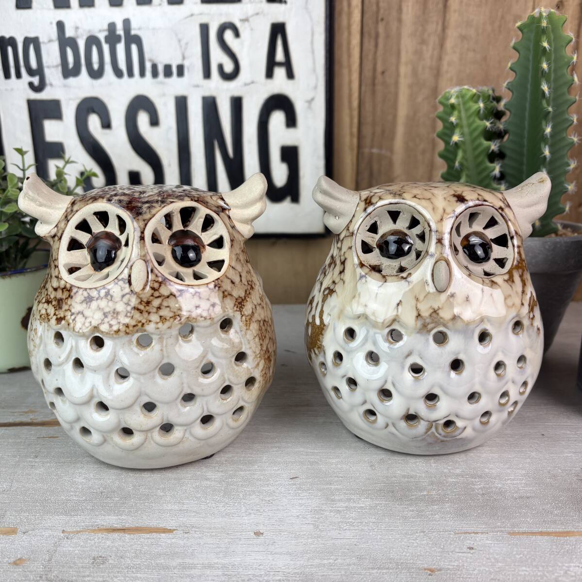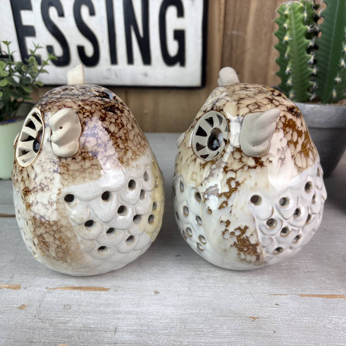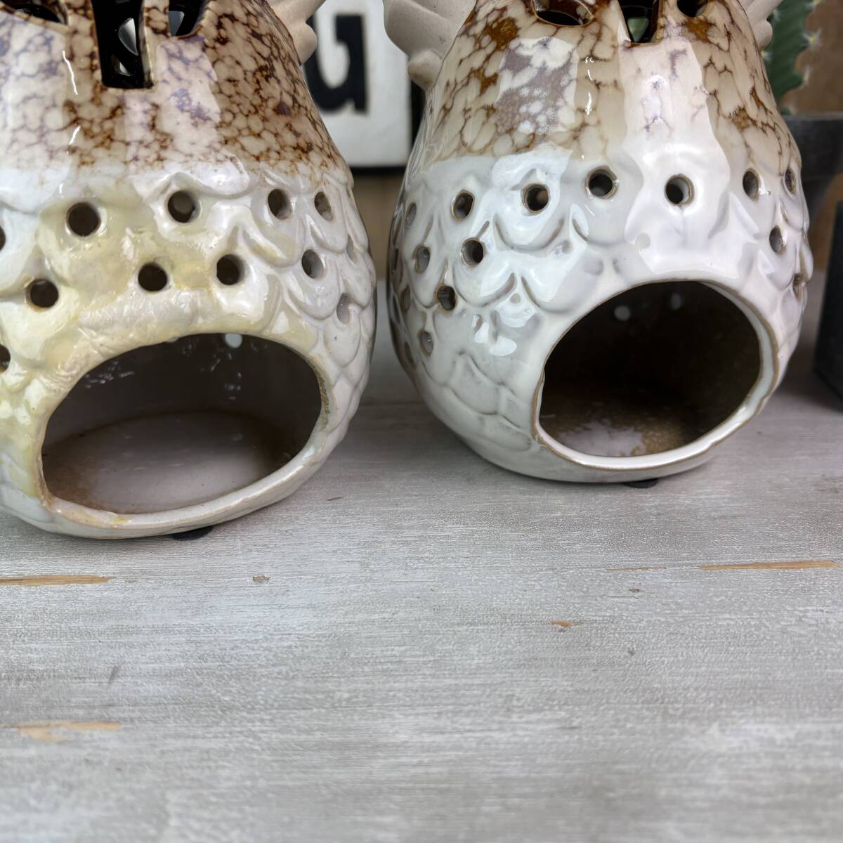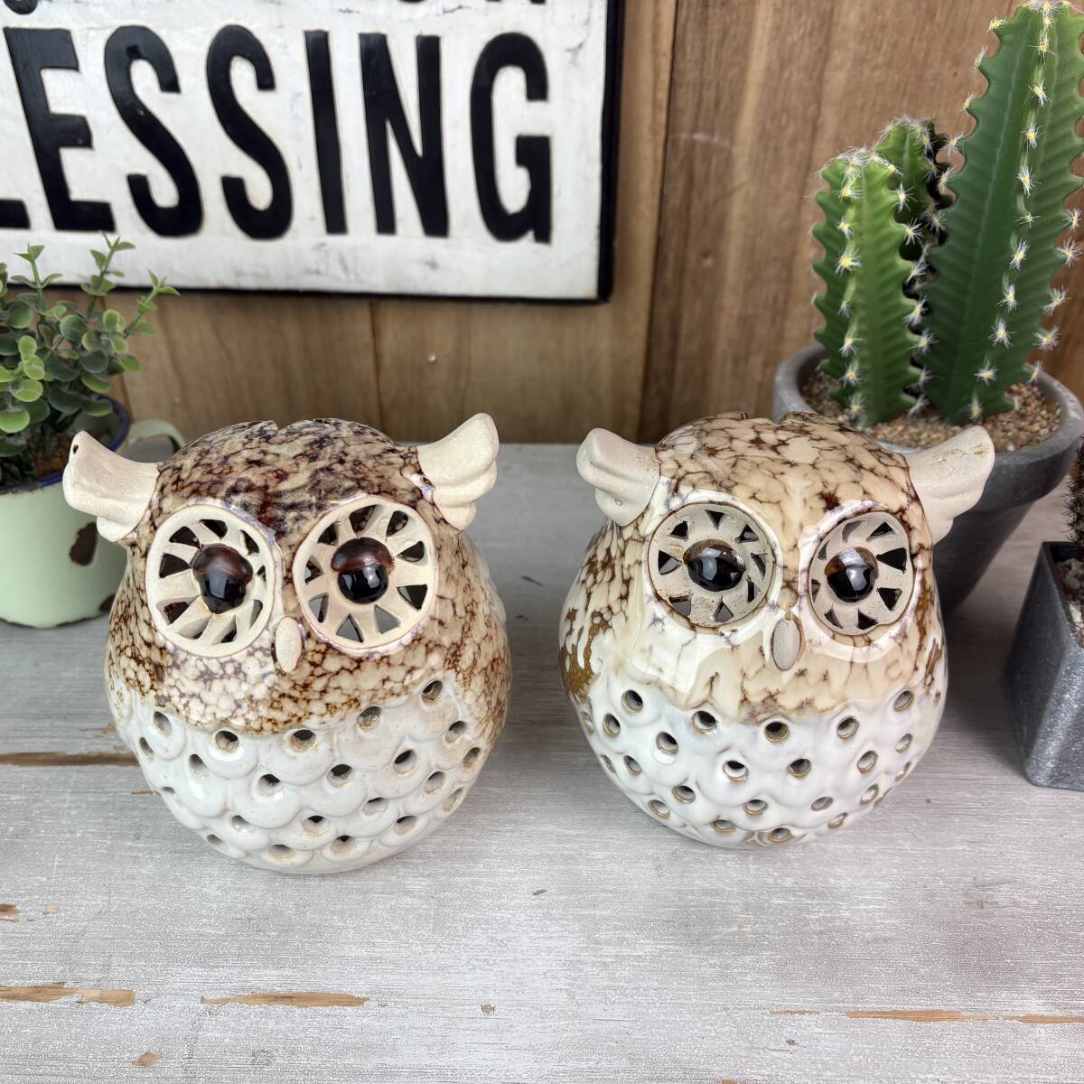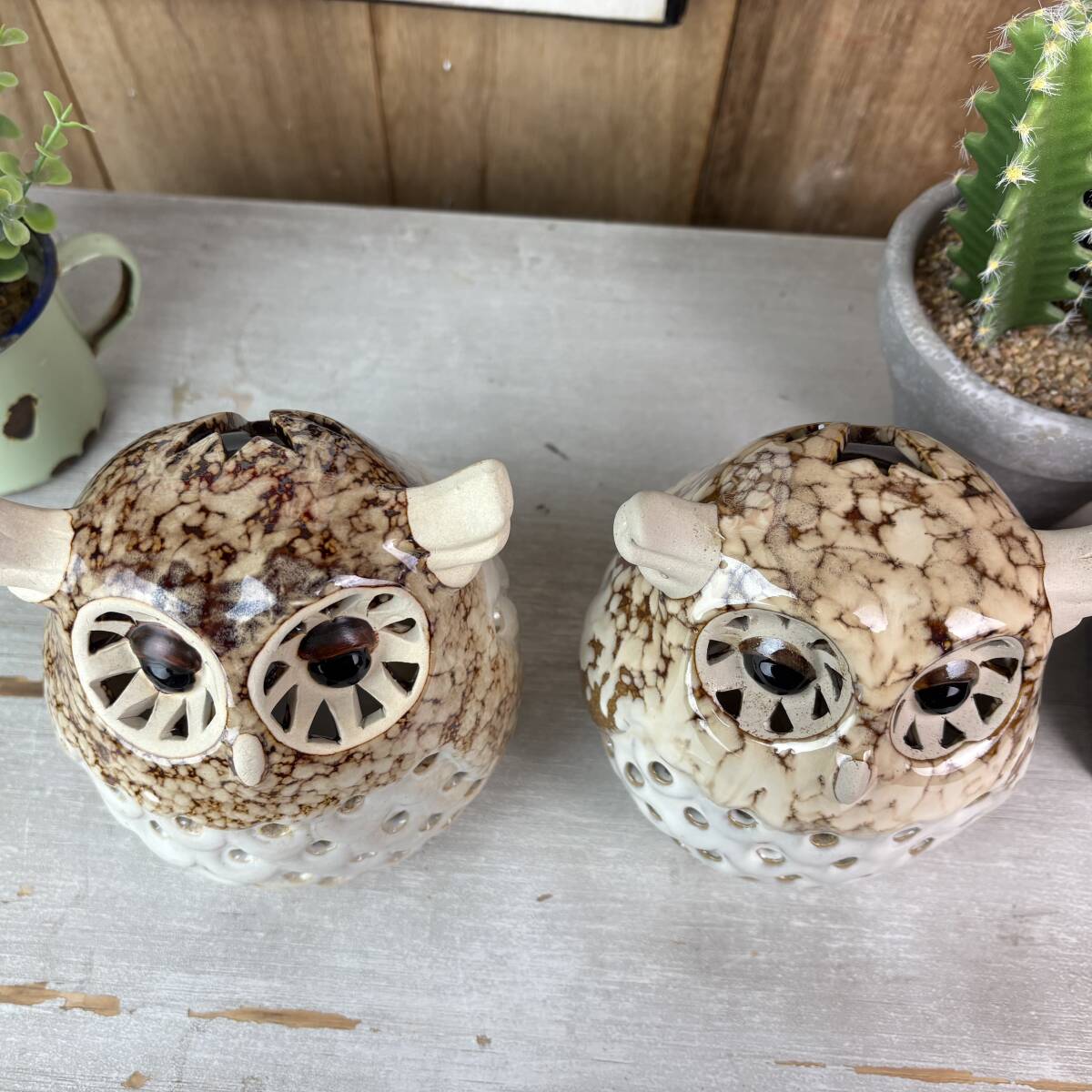ふくろうキャンドルスタンド2点セットです。インテリア置物、ガーデン装飾に最適な可愛いフクロウです。陶器のぬくもり溢れる素敵なお品!洋室、和室にはもちろんアジアンテイストなどどんなお部屋にもピッタリです!縁起物のふくろうは今話題でプレゼントにも喜ばれます☆お部屋のインテリア、ガーデン小物、ショップのディスプレイなどに役立ちそうですね(^-^)アロマキャンドルにも最適!