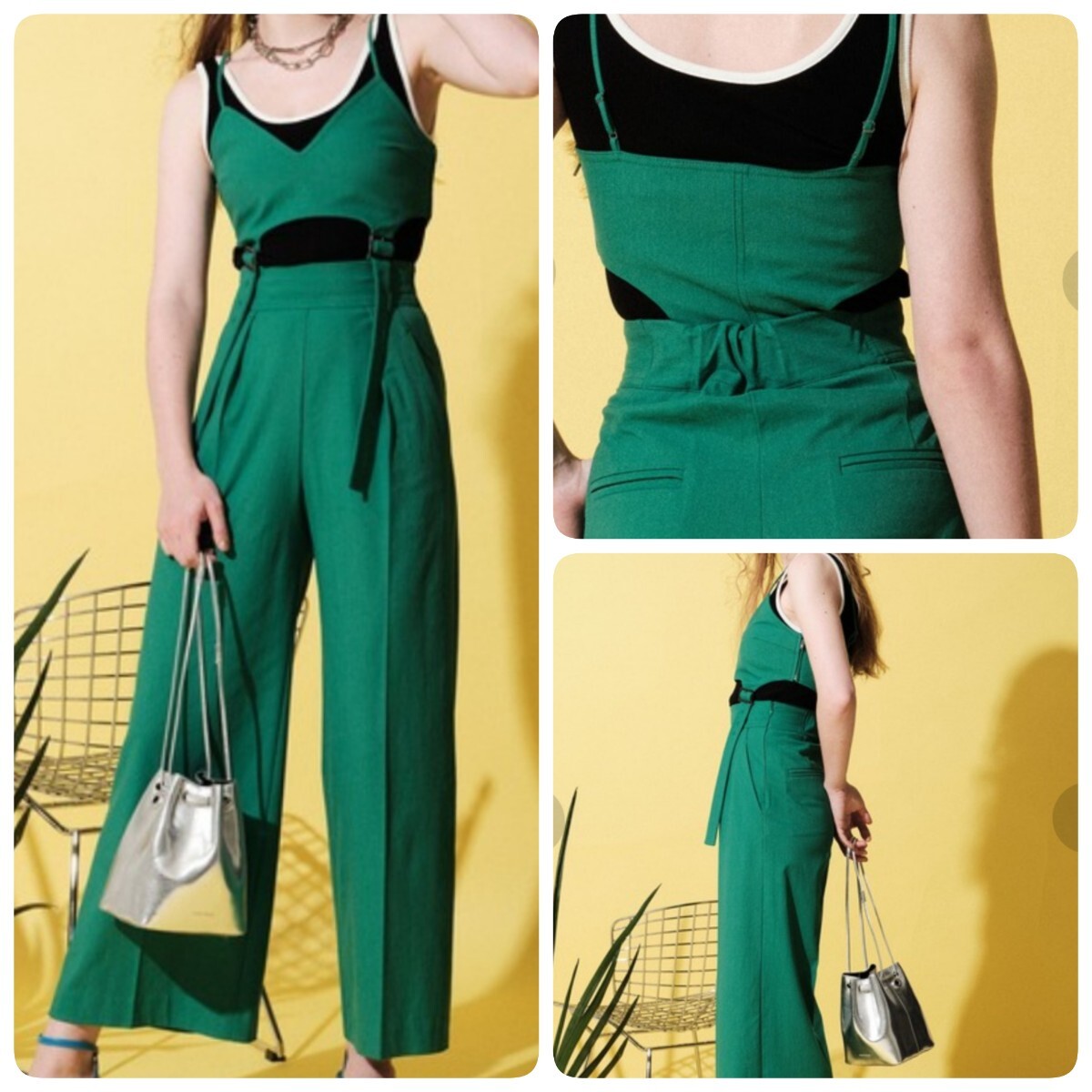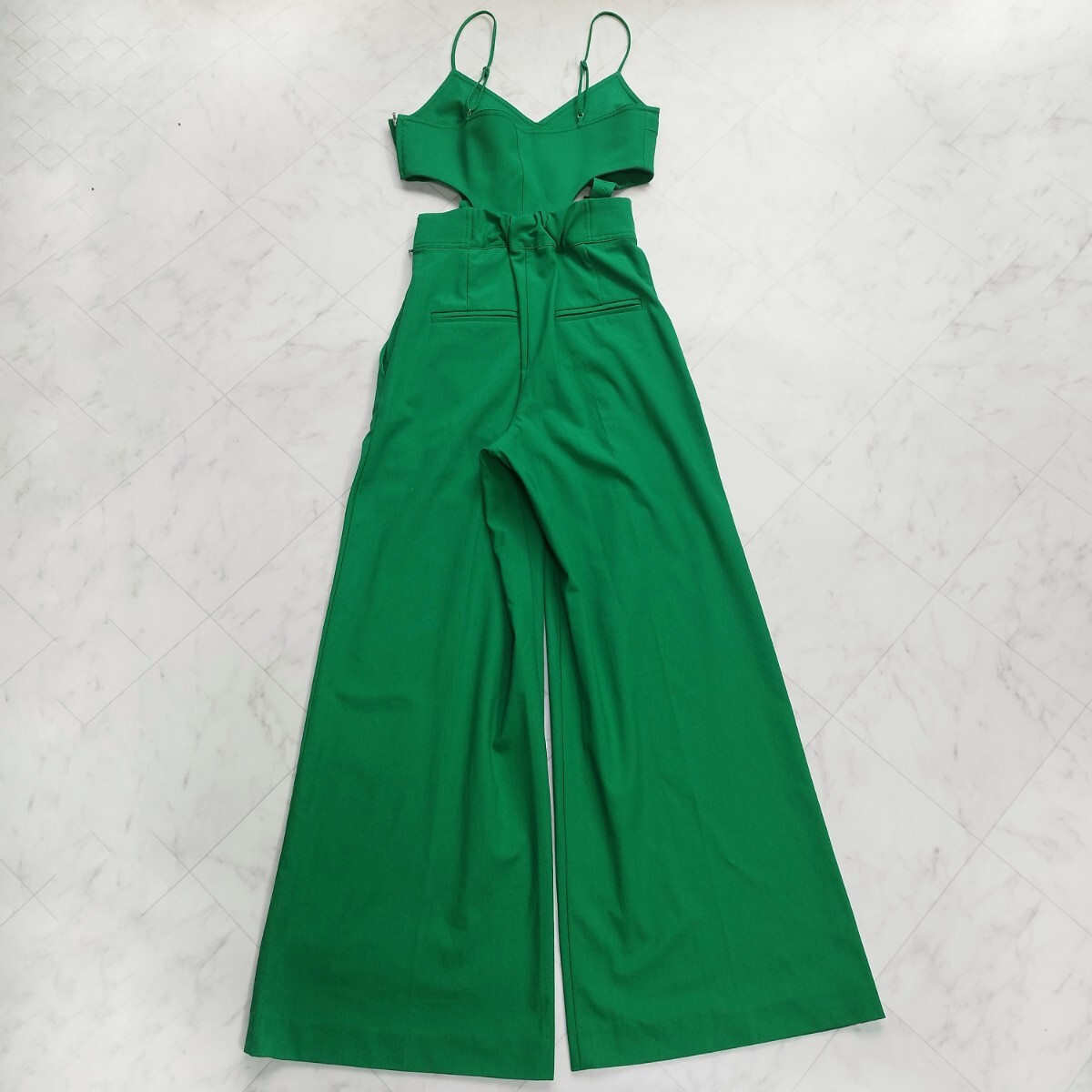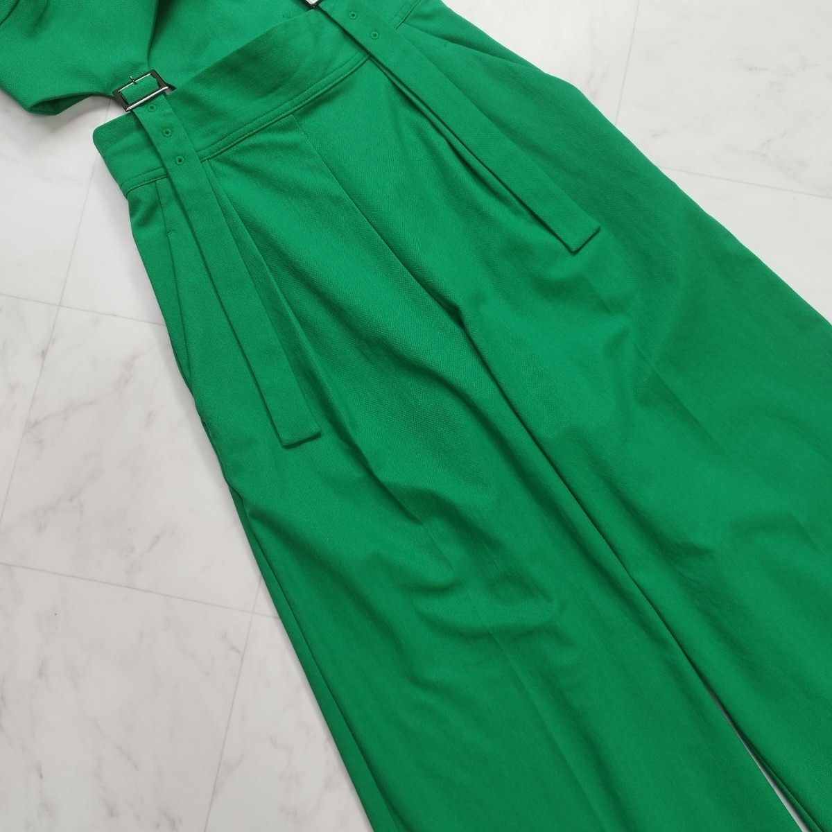 ビスチェとパンツをベルトディテールで繋げたモードなデザインのオールインワン。ビスチェの裾のベルトで長さを調整することでシルエットに変化をつけることができます。ワイドシルエットでリラックス感がありますが、ハイウエスト設定なのでスタイルアップ効果も◎