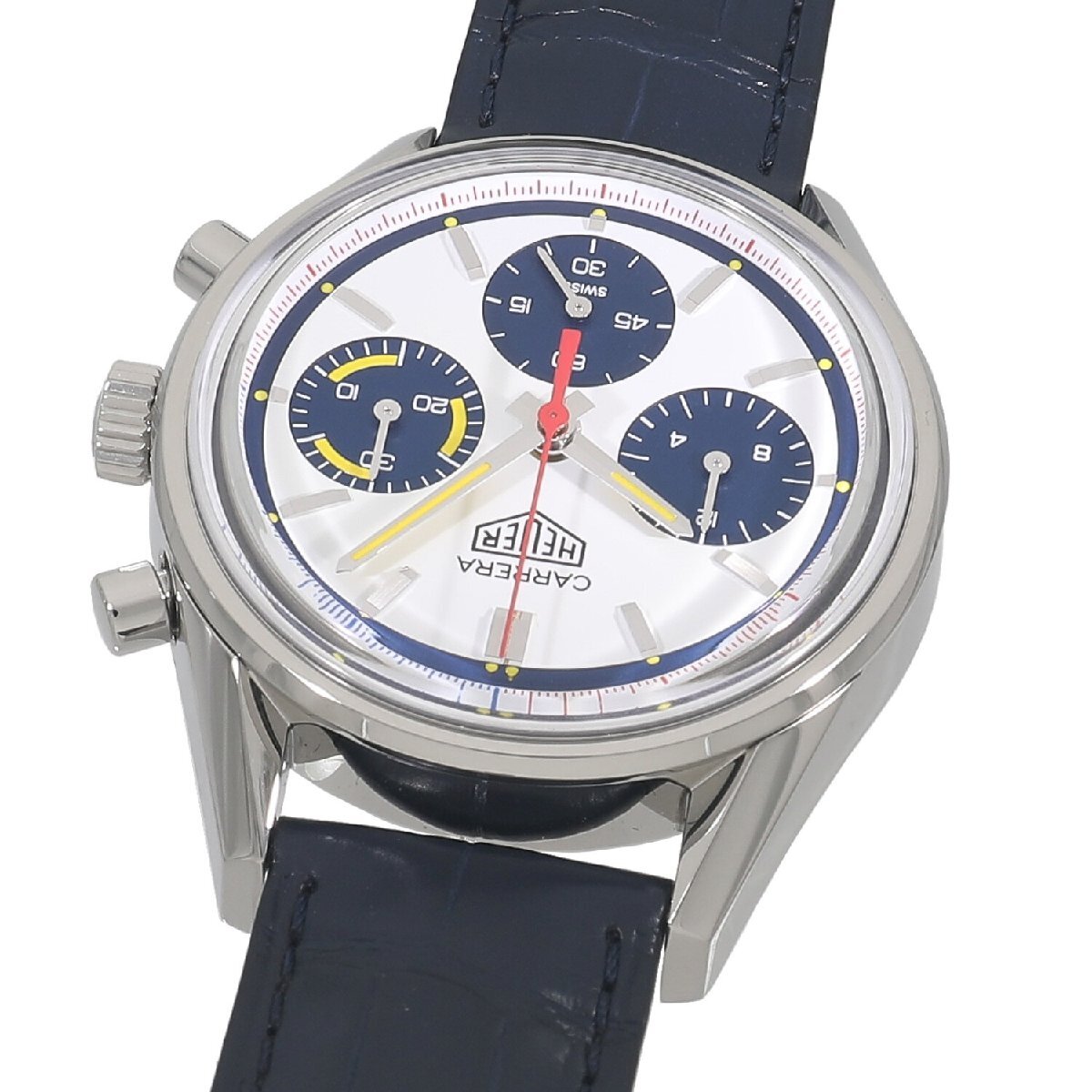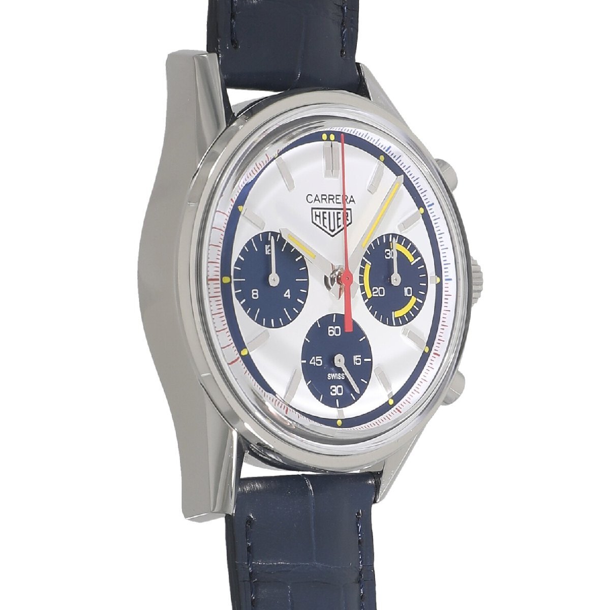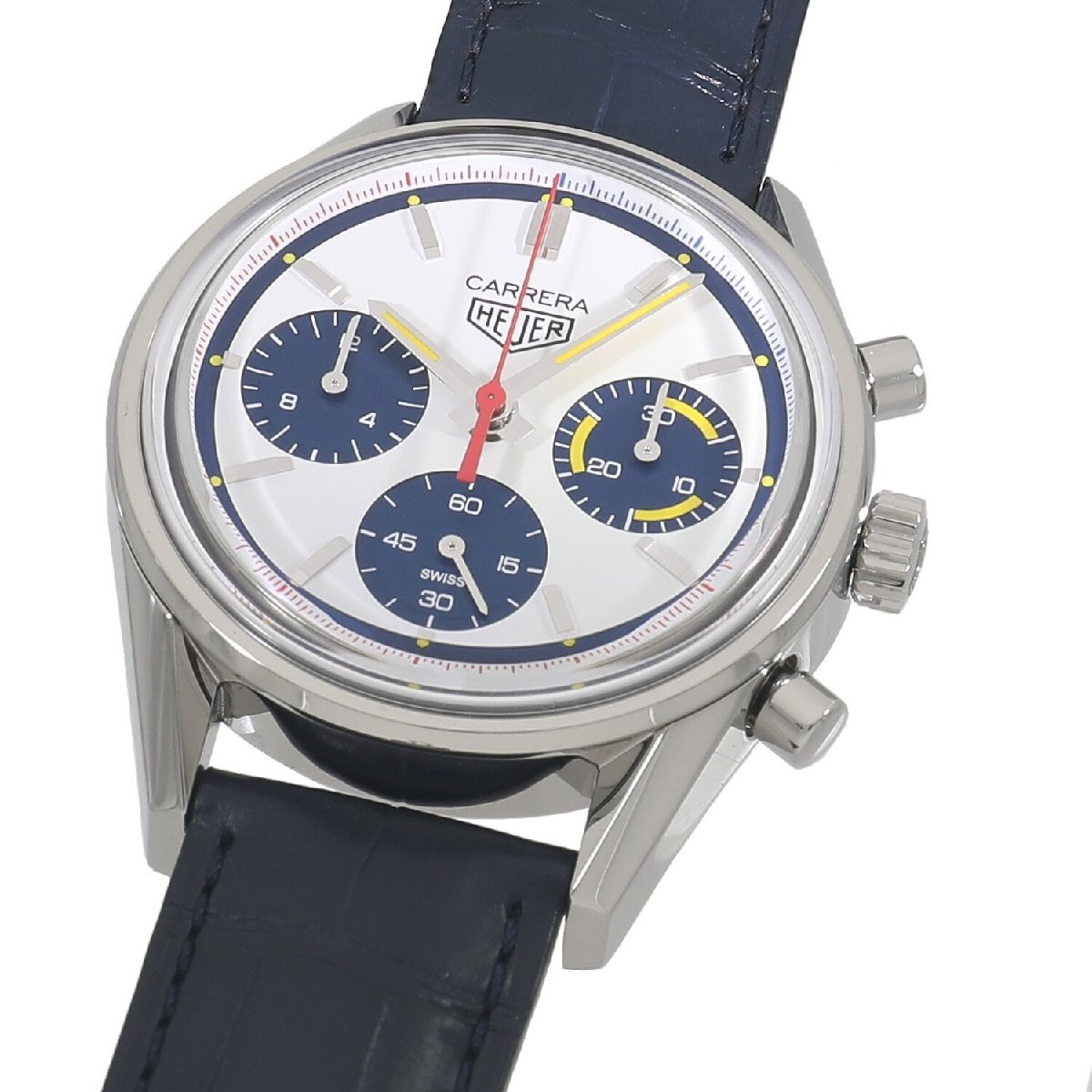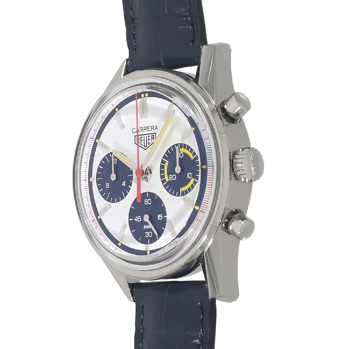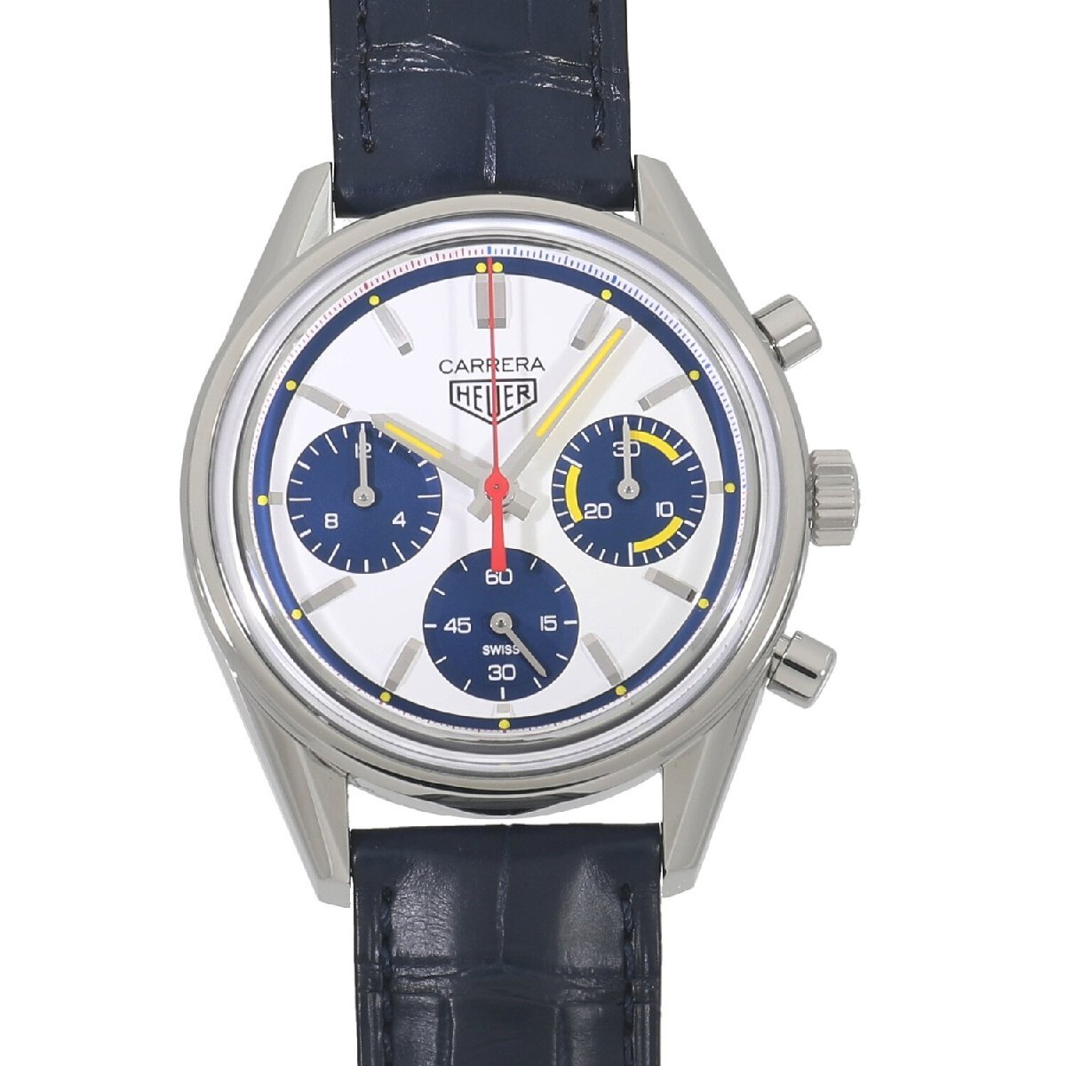 モデルについて | 2020年の新作 1963年に発表された初代カレラ(Ref.2447S)を復刻。初代モデルのデザインを忠実に再現しながらも、風防はサファイアガラス、夜光はスーパールミノバ、キャリバーは最新のホイヤー02を採用するなど、現代にマッチする仕様へと変更されています。ムーブメントのローターや純正ボックスなども、記念モデルらしく特別な仕様となっております。ホワイトをベースにブルーのインダイヤル、差し色にイエローを使ったマルチカラーのダイヤルは、1970年代に発表された名機モントリオールを彷彿とさせるデザインです。限定数は1000本と大変希少です。 |