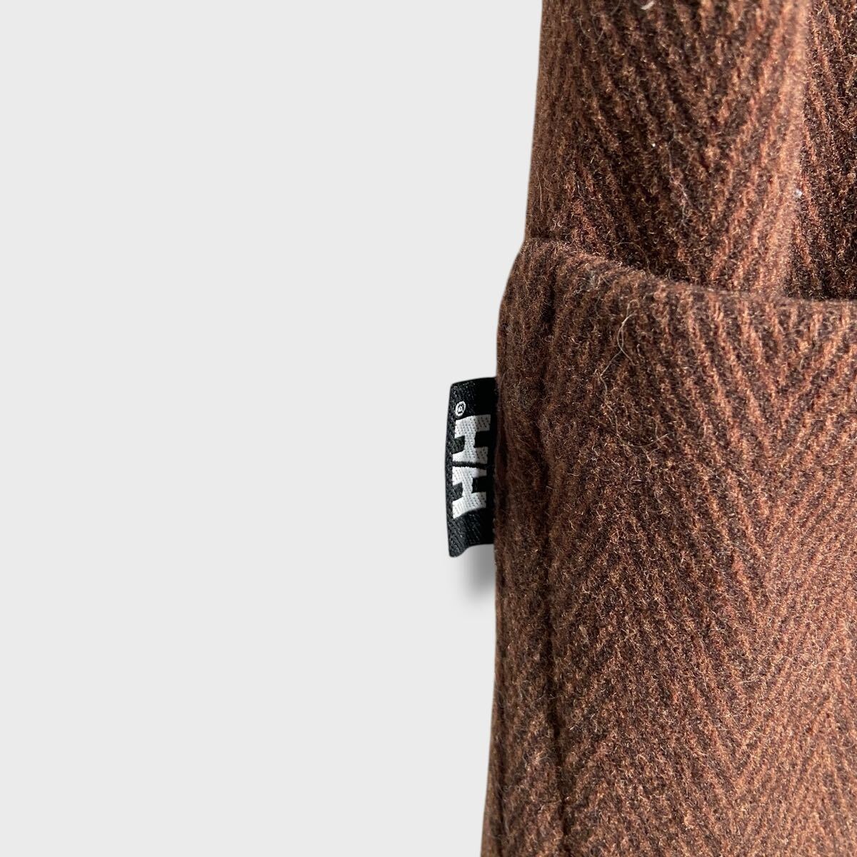 ブラウンカラーのウール混合素材で、ヘリンボーン織りです。