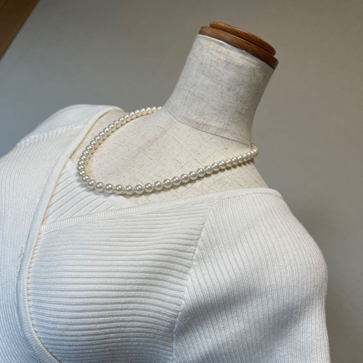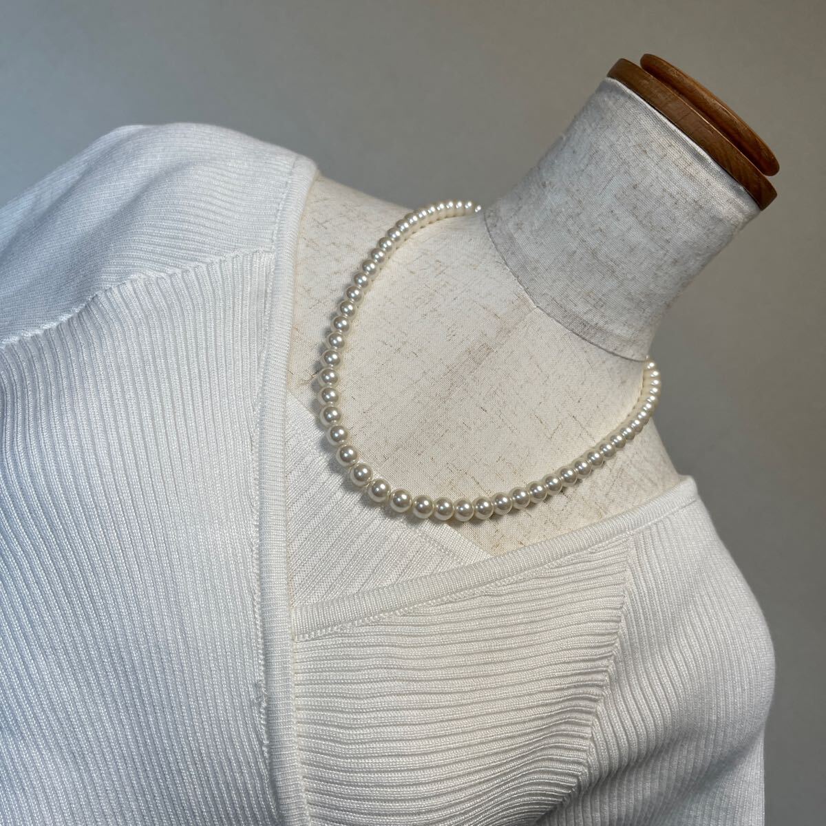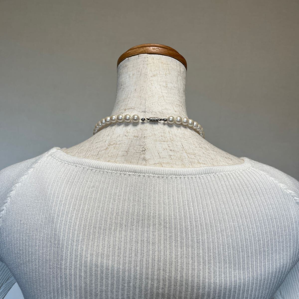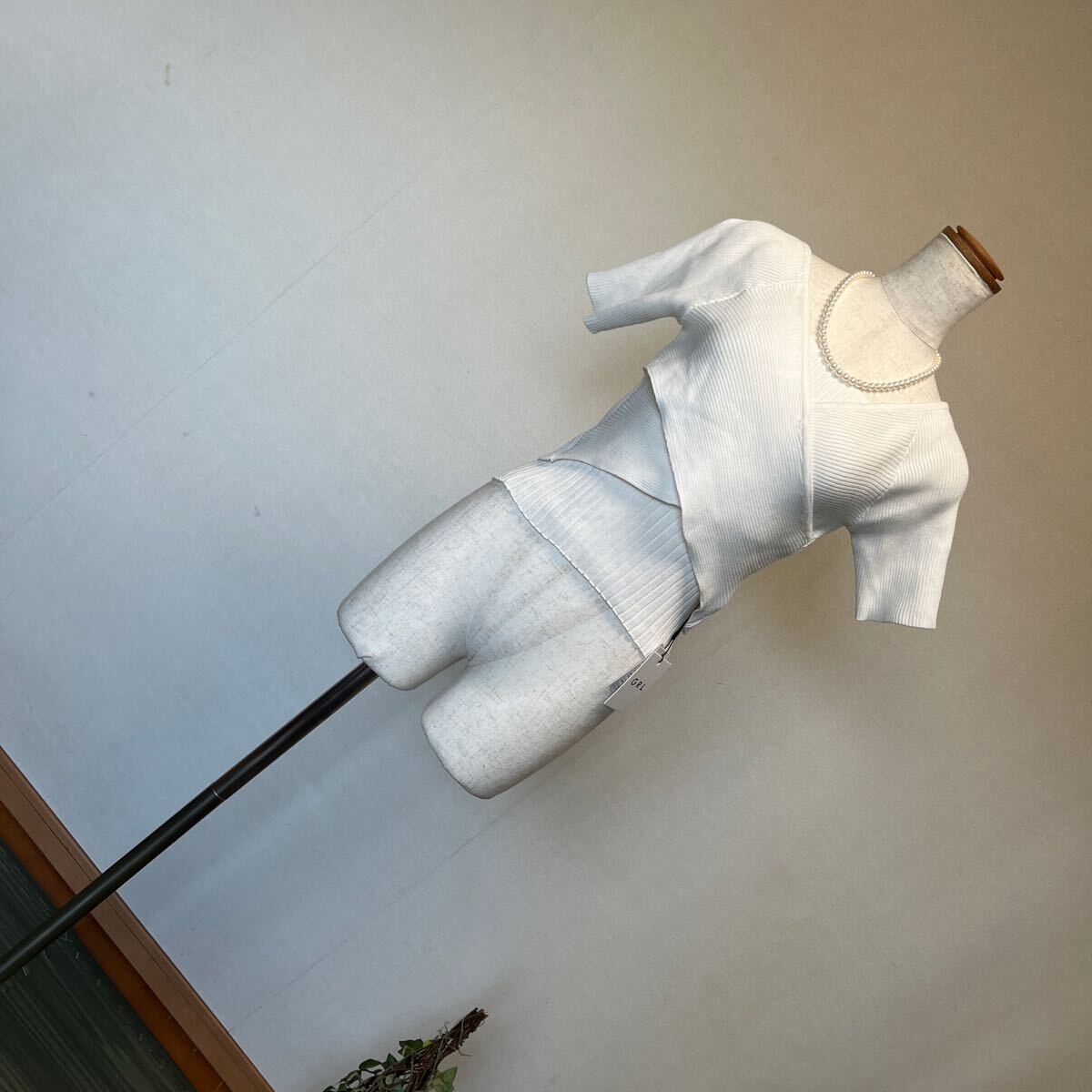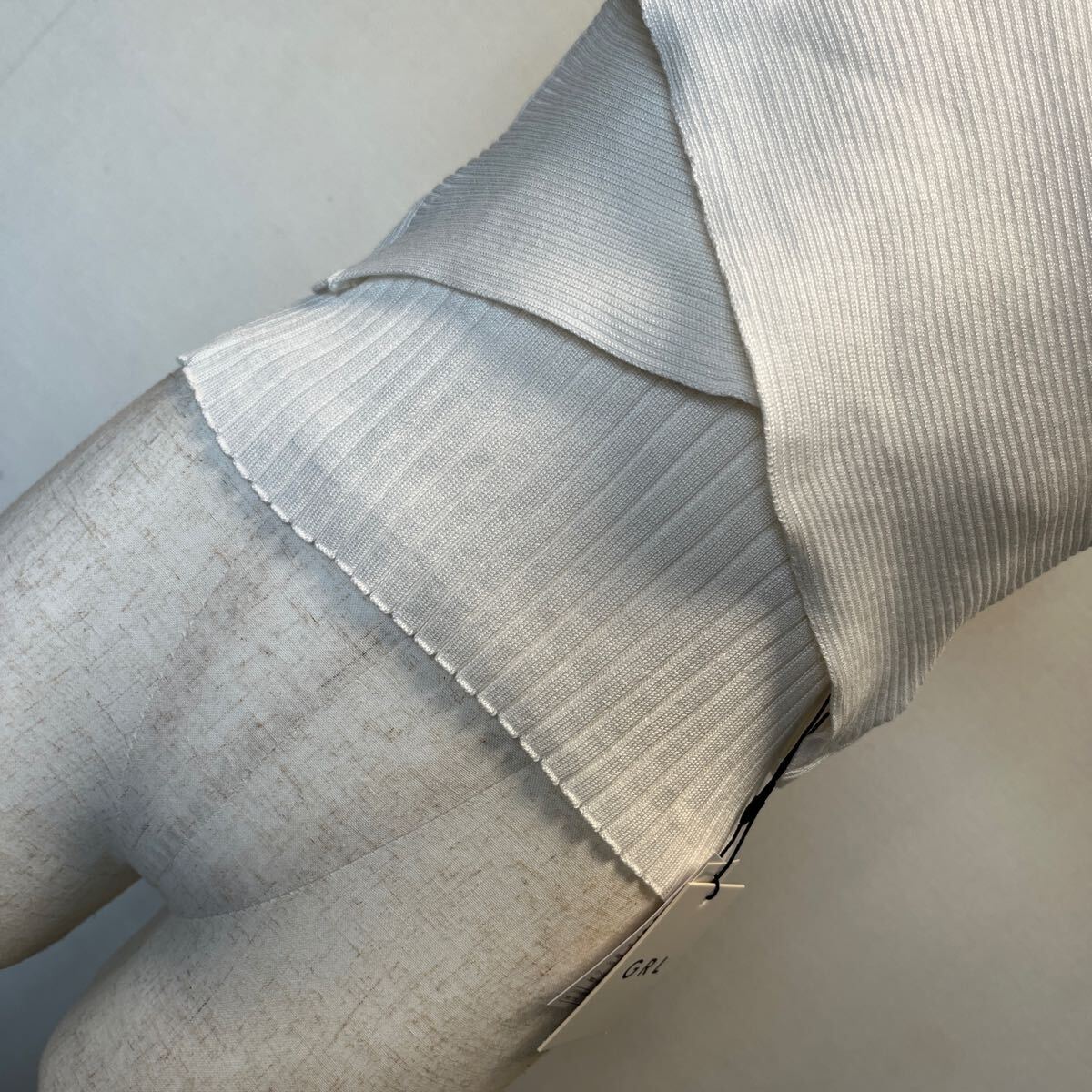 新品のさらっとした肌触りで伸縮性の良いリブニット素材で仕上げたセットアップ。 ボディラインにスッキリと沿うタイトシルエットでスマートなルックスにアップデート。 程よくデザインされたショート丈でトレンド感もプラス。 女性らしく美しく魅せるフロントのカシュクールデザインがスタイリングのポイント。 ネックレスはついていません。
