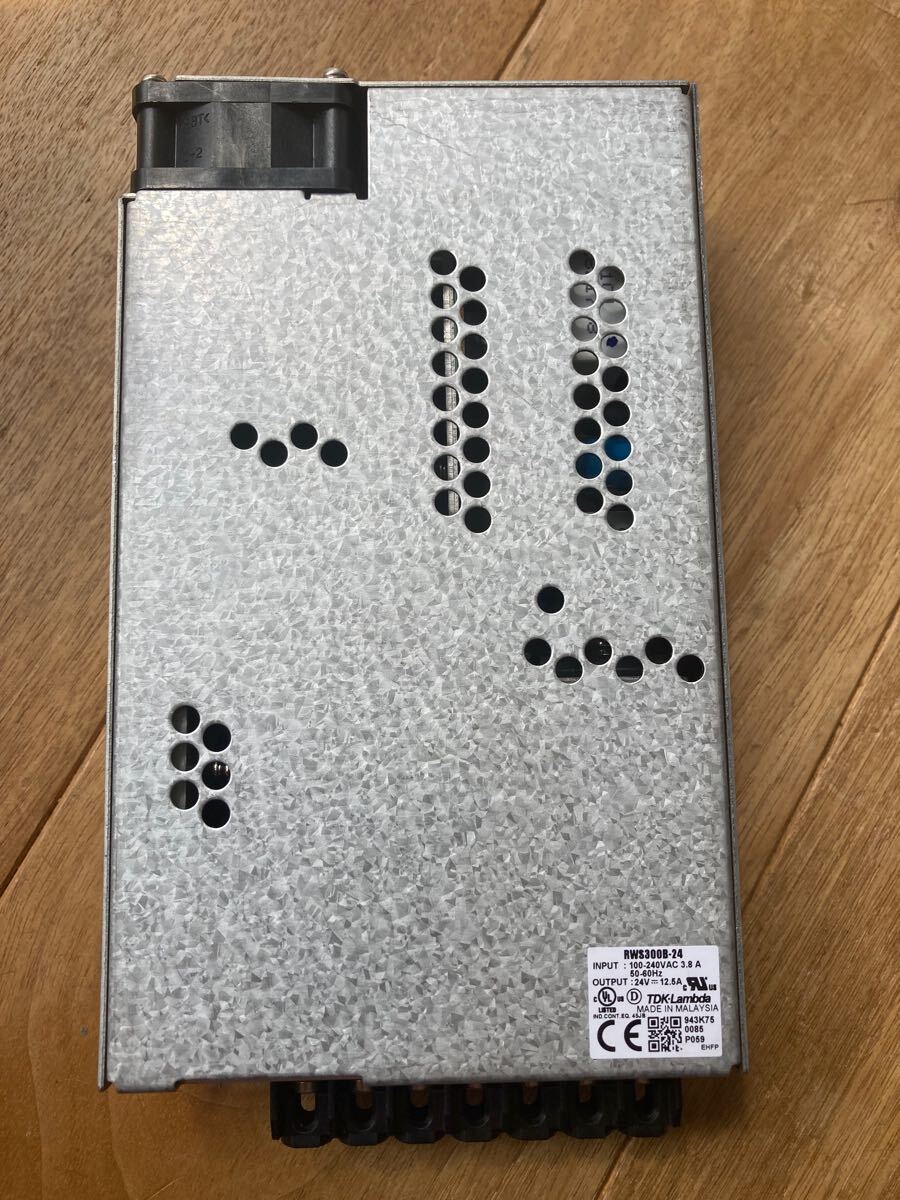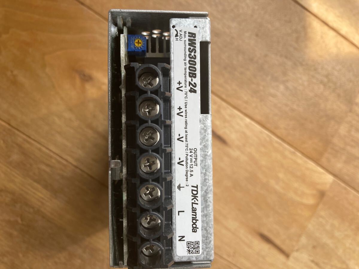 型式はRWS300B-24 AC85~265VまたはDC120~370V入力、最大出力12.5A、出力は端子台近くにボリュームがついており、出力電圧を可変できます。