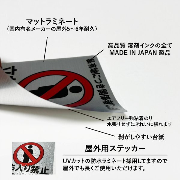 ●私有地への不法侵入や関係者以外の立ち入りをしないでほしい事を伝えれるヘアラインで高級感あふれる便利ステッカーです。
