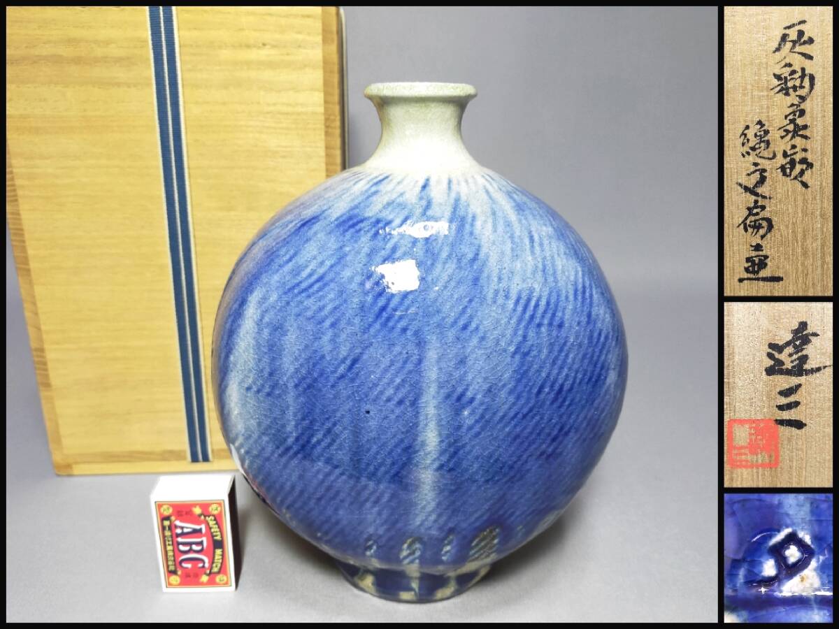 IA27 花瓶 人間国宝 島岡達三 造 灰釉象嵌 縄文扁壷 花入 高24cm 共箱 師:浜田庄司 古美術品