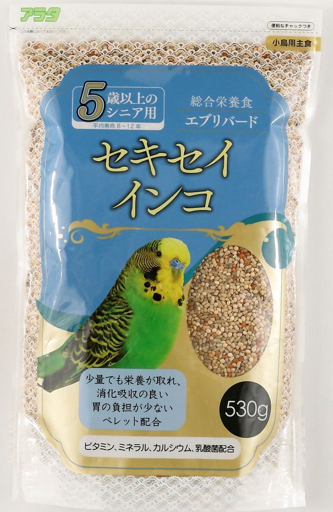 少量でも栄養が取れ、消化吸収の良い胃の負担が少ないペレットを配合したシニア用セキセイインコの総合栄養食です。ビタミン、ミネラル、カルシウム、乳酸菌配合
