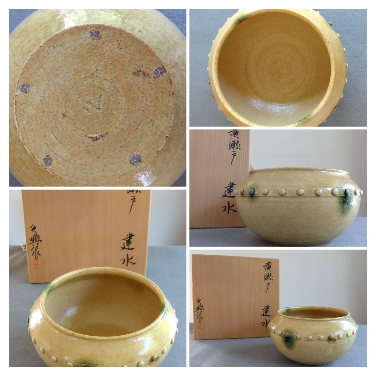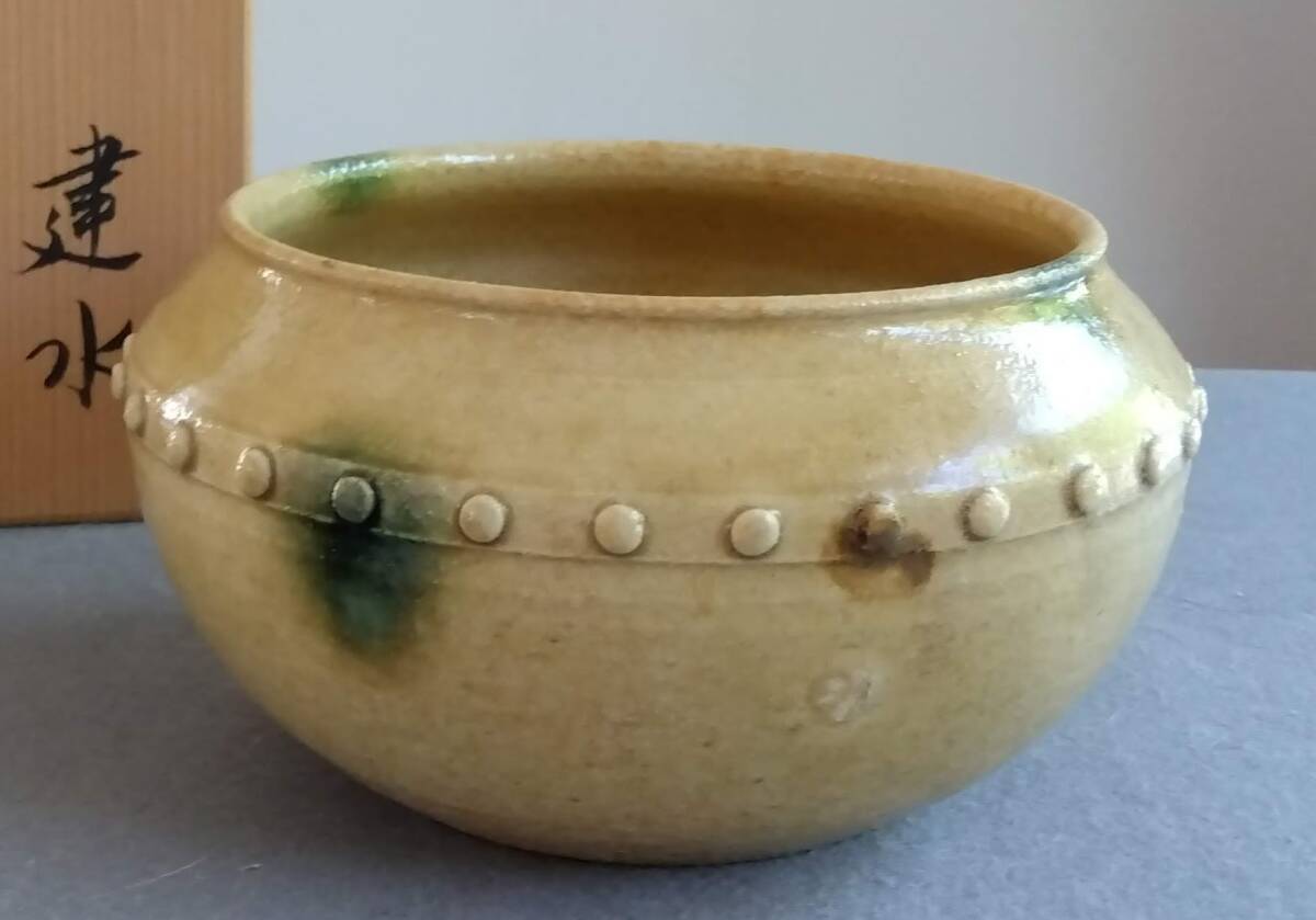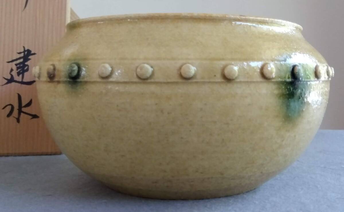 美濃焼の名工 大嶋久興 【子の日窯】黄瀬戸「油揚げ手」希少美品 茶道具建水 師の卓越したろくろ使いヘラ削りによる胴腰回り全体を極限まで薄く仕上げた厚み成形が 軽白磁に勝る優美かつふくよかな存在感をもたらしています。 口づくりから胴腰に掛けての豪快かつ繊細なへら使いで どっしりとした重量感/躍動美/風趣が溢れる建水です。 中国伝来の銅器建水を模した肩口全体に付された丸鋲がモダニズムに進化し きわめて瀟洒(しょうしゃ)な味わい深い雅陶の胆礬(タンパン;硫酸銅の釉で、緑色になる)で彩られ これら安土桃山伝統美紋様は おてまえに極上至福のひと時をもたらし 無限の幽玄美/崇高美おも感じさせる心和む風趣を醸し出しています。 安土桃山時代の陶芸家魂を綿々とうけつぐ無限の幽玄美/崇高美をも感じさせる心和む時空を超えた悠久の流れをご堪能下さい。 サイズ 口径135㎜ 全高90mm 見込み85mm底95mm 大嶋久興師作陶に思う事 【黄瀬戸中心の仕事をしておりますが、織部、粉引き等その他の焼き物にも興味があります。 黄瀬戸は今もわからない事ばかりで悪戦苦闘の毎日です。少し派手目で気持ちのよい色合いが出せればと思っております。 派手な所と地味な面を持つ不思議な焼き物が黄瀬戸の一面であると思っております。大嶋久興】