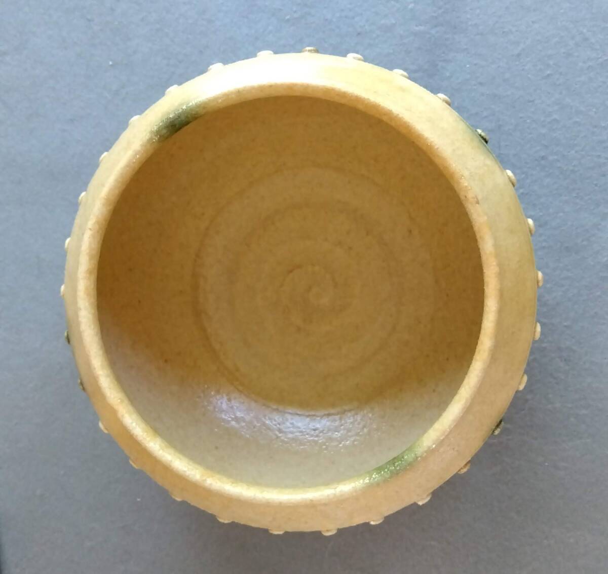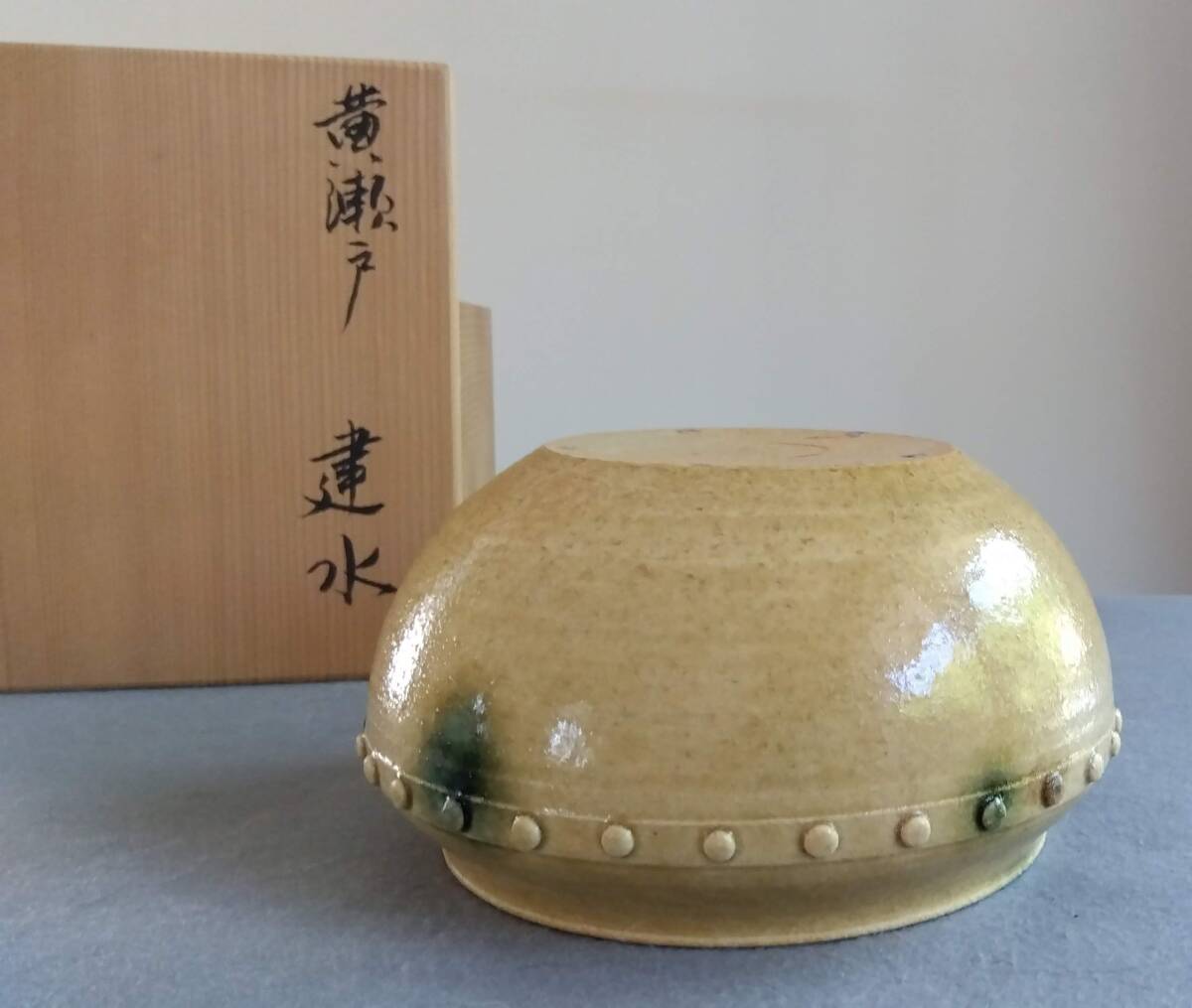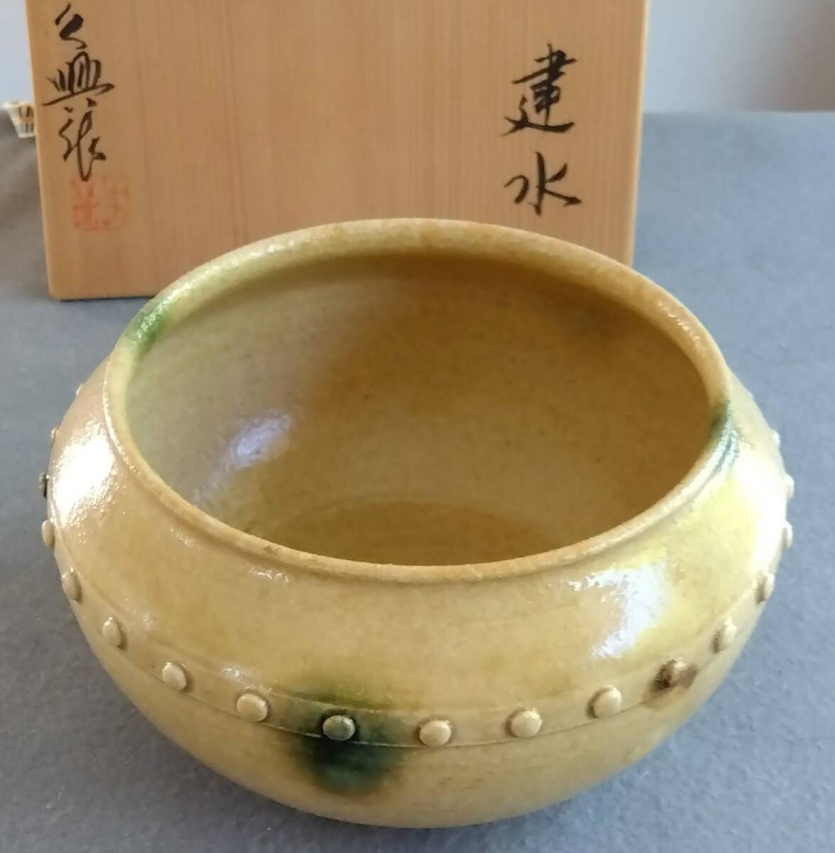 美濃焼の名工 大嶋久興 【子の日窯】黄瀬戸「油揚げ手」希少美品 茶道具建水 師の卓越したろくろ使いヘラ削りによる胴腰回り全体を極限まで薄く仕上げた厚み成形が 軽白磁に勝る優美かつふくよかな存在感をもたらしています。 口づくりから胴腰に掛けての豪快かつ繊細なへら使いで どっしりとした重量感/躍動美/風趣が溢れる建水です。 中国伝来の銅器建水を模した肩口全体に付された丸鋲がモダニズムに進化し きわめて瀟洒(しょうしゃ)な味わい深い雅陶の胆礬(タンパン;硫酸銅の釉で、緑色になる)で彩られ これら安土桃山伝統美紋様は おてまえに極上至福のひと時をもたらし 無限の幽玄美/崇高美おも感じさせる心和む風趣を醸し出しています。 安土桃山時代の陶芸家魂を綿々とうけつぐ無限の幽玄美/崇高美をも感じさせる心和む時空を超えた悠久の流れをご堪能下さい。 サイズ 口径135㎜ 全高90mm 見込み85mm底95mm 大嶋久興師作陶に思う事 【黄瀬戸中心の仕事をしておりますが、織部、粉引き等その他の焼き物にも興味があります。 黄瀬戸は今もわからない事ばかりで悪戦苦闘の毎日です。少し派手目で気持ちのよい色合いが出せればと思っております。 派手な所と地味な面を持つ不思議な焼き物が黄瀬戸の一面であると思っております。大嶋久興】