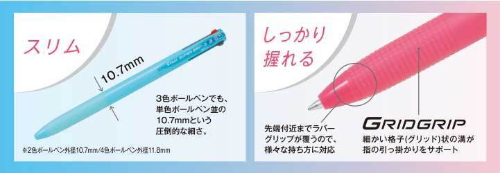 しっかり握れてスリムに携帯できる、カラフルボディの油性多色ボールペン。