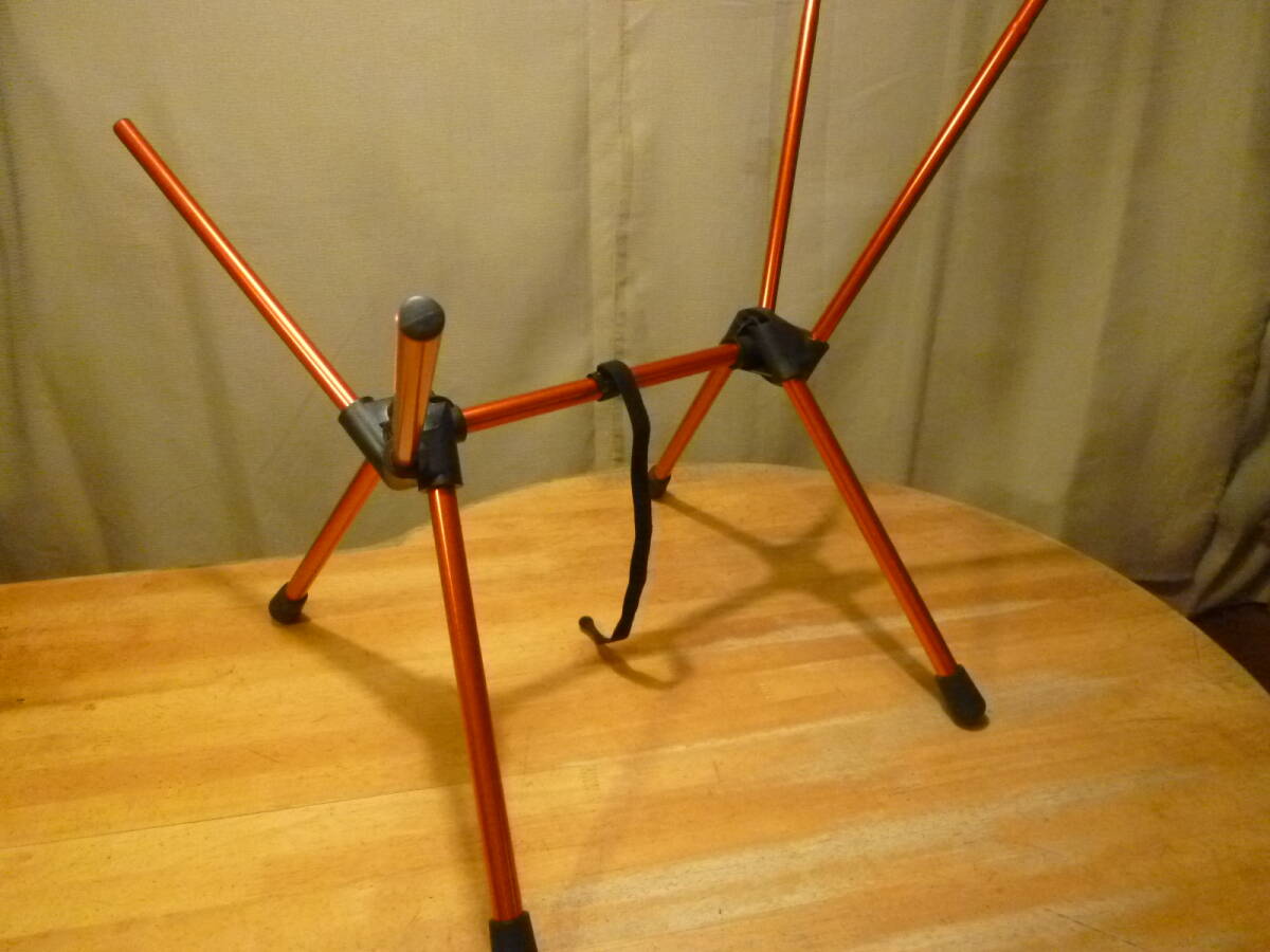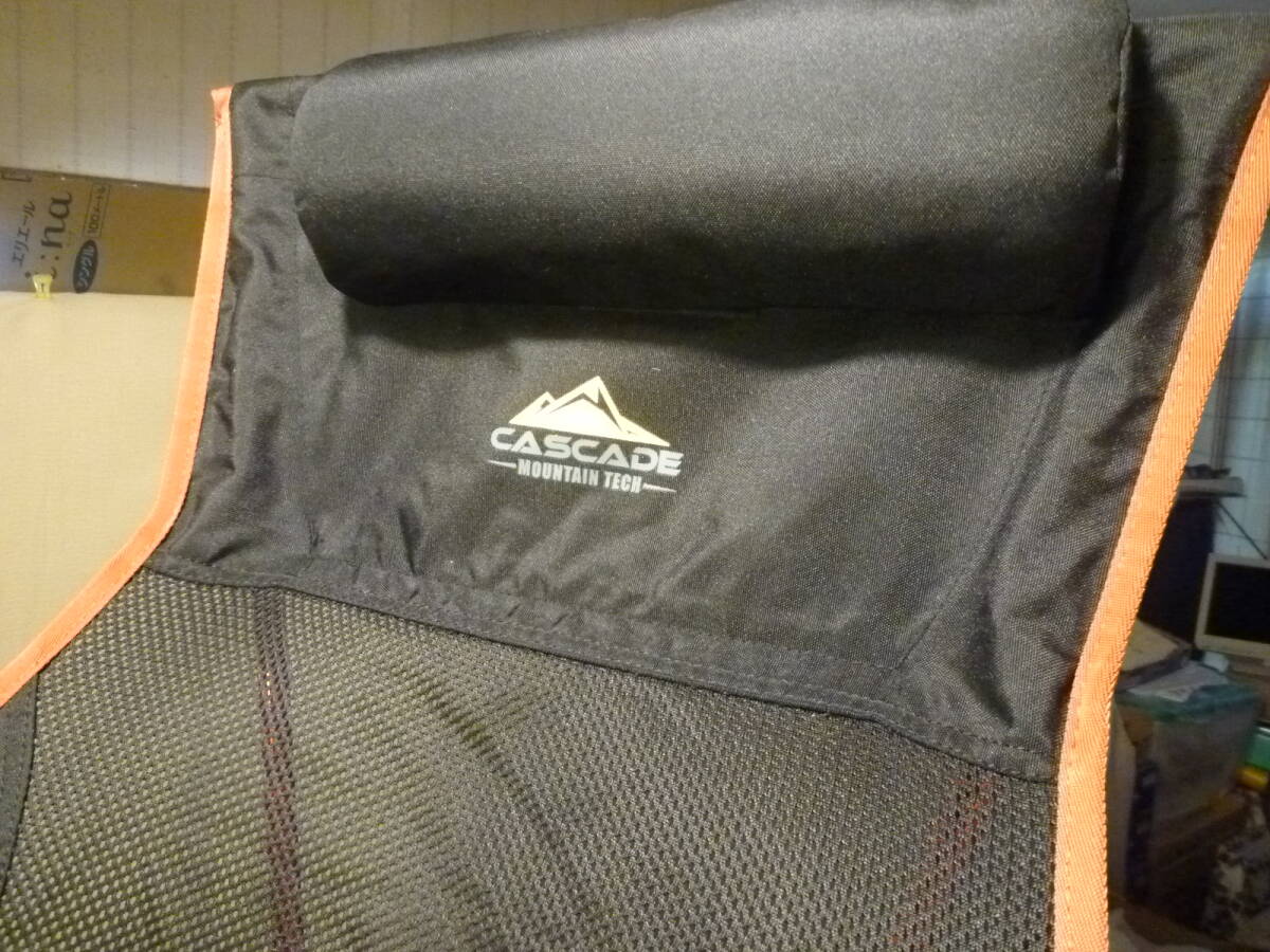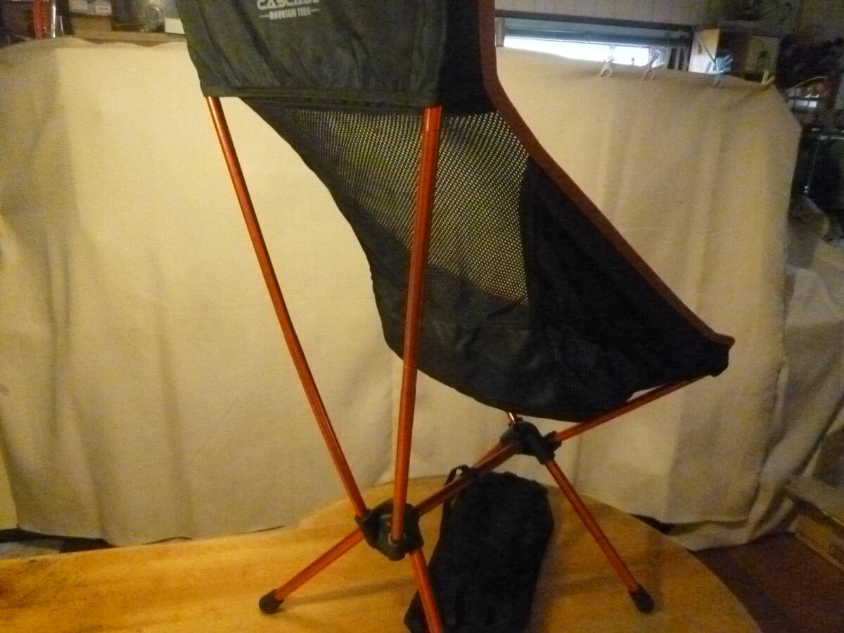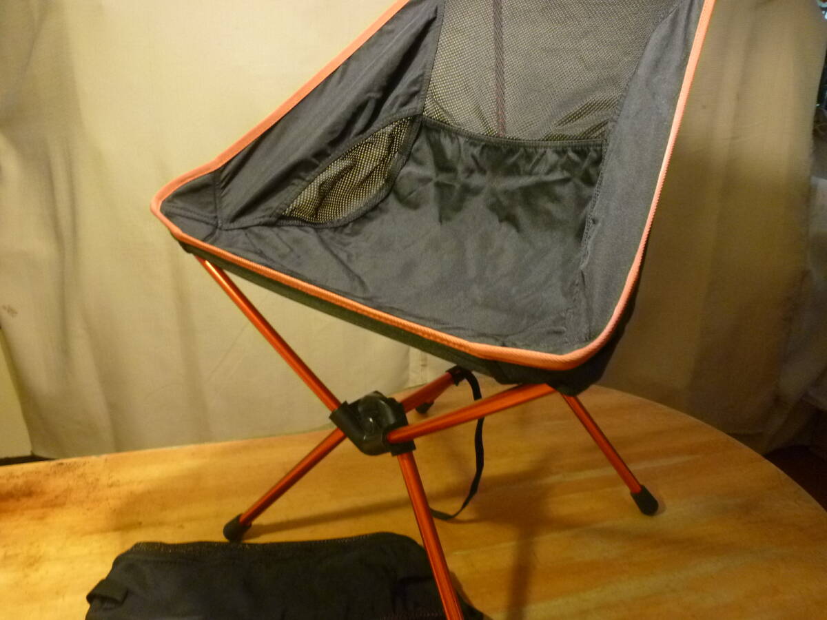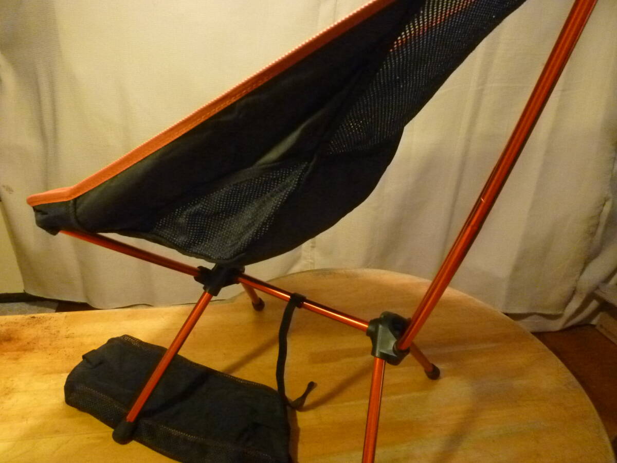 こちらは外遊び等には欠かせないと思われる超軽量ポータブルハイバックチェアとあります。アルミ製の折りたたみ式脚にキャンバス地とメッシュの椅子部をセットするとたちまち快適な少しクッションのあるチェアになり、頭部には枕?もマジック止め出来、組み立て方は収納袋にあります。