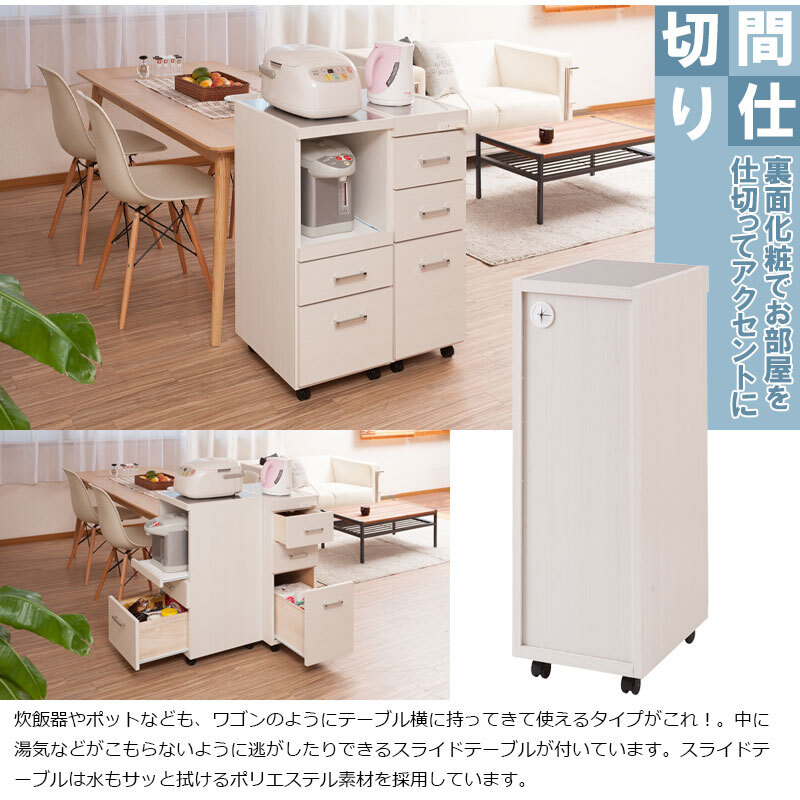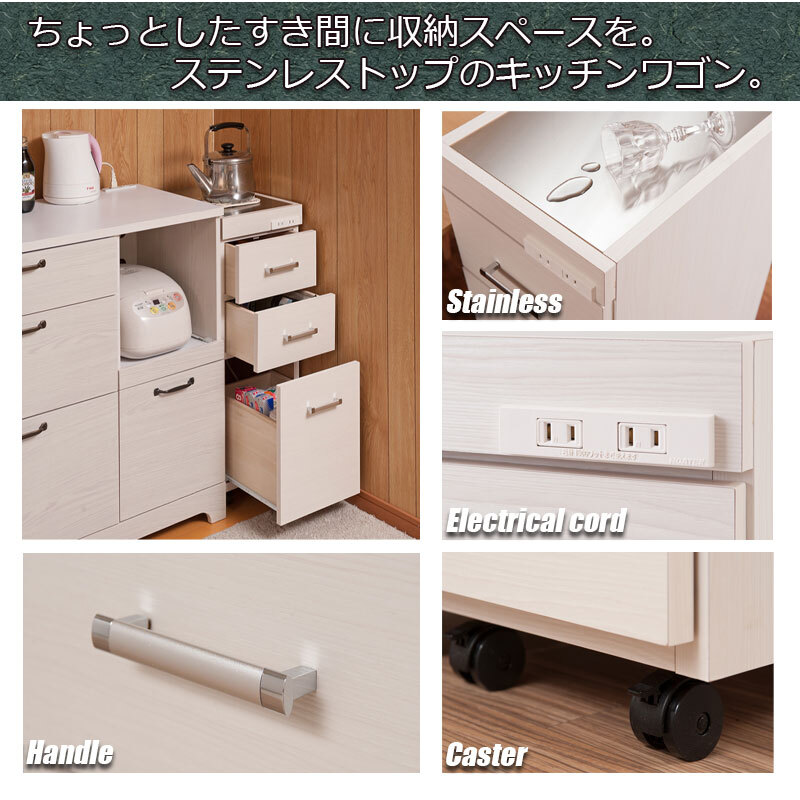 ■商品について/デッドスペースはもちろん隙間を有効活用できる『Sinker』シリーズ。今まで足りなかった作業スペースや収納スペースをこれ1台で解決!ストレスなく料理ができる、うれしいキッチンアイテム。キッチンだけでなくデスクサイドやランドリーにもあらゆるシーンに対応。取っ手は持ち手部にマットなアルミ材を使用し高級感あります。ステンレストップで水に強く、機能ともに優秀なカウンターワゴンです。