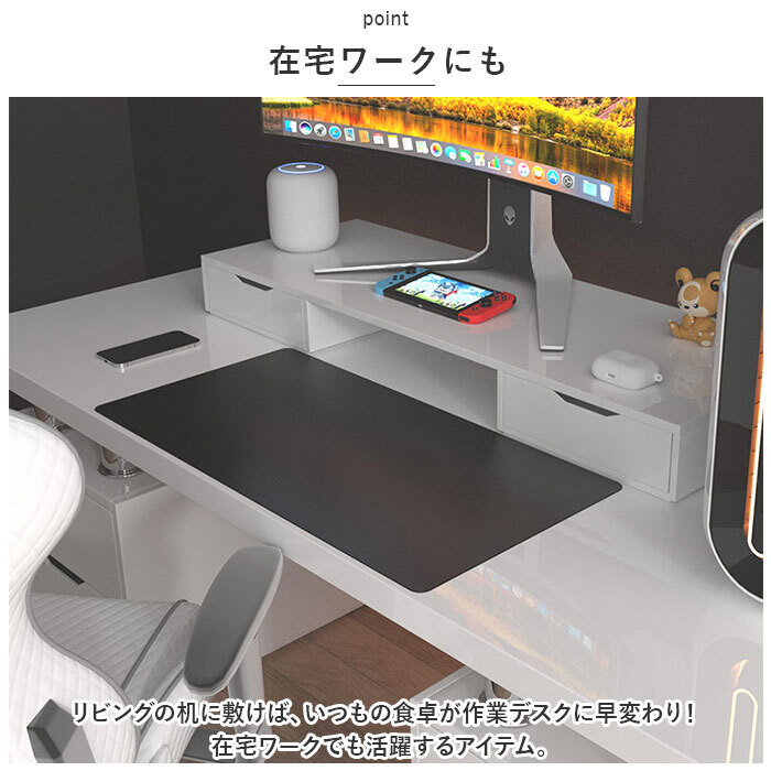 | 商品説明 | ・・マットを敷いてPC作業などデスク業務をスムーズに♪撥水加工で汚れに強い「デスクマット」が登場! ・【作業スペースに】 ・オフィスやお家のデスクに敷くだけで、簡単に作業スペースを確保できる◎お仕事や事務作業、勉強に役立つアイテム。 ・【在宅ワークにも】 ・リビングの机に敷けば、いつもの食卓が作業デスクに早変わり!在宅ワークでも活躍するアイテム。 ・【撥水加工】 ・表面には撥水加工を施し、汚れに強い仕様に。汚れたら水拭きOK。キレイに保てるのも嬉しいポイント。 ・【滑りにくい】 ・マットの表面には凹凸があり、ほどよく滑りにくい構造。マウスパットの役割もしてくれ優れもの。ゲーミングにも◎ ・【快適なデスクに】 ・ほどよい柔らかさが手元に馴染み、作業や勉強がはかどる。快適なワークスペースを提供してくれる。 ・【シンプルデザイン】 ・シンプルなデザインなので、シーンや場所を選ばずに使用できる。年齢性別問わないので、ご家族で共有するのもGOOD。 |