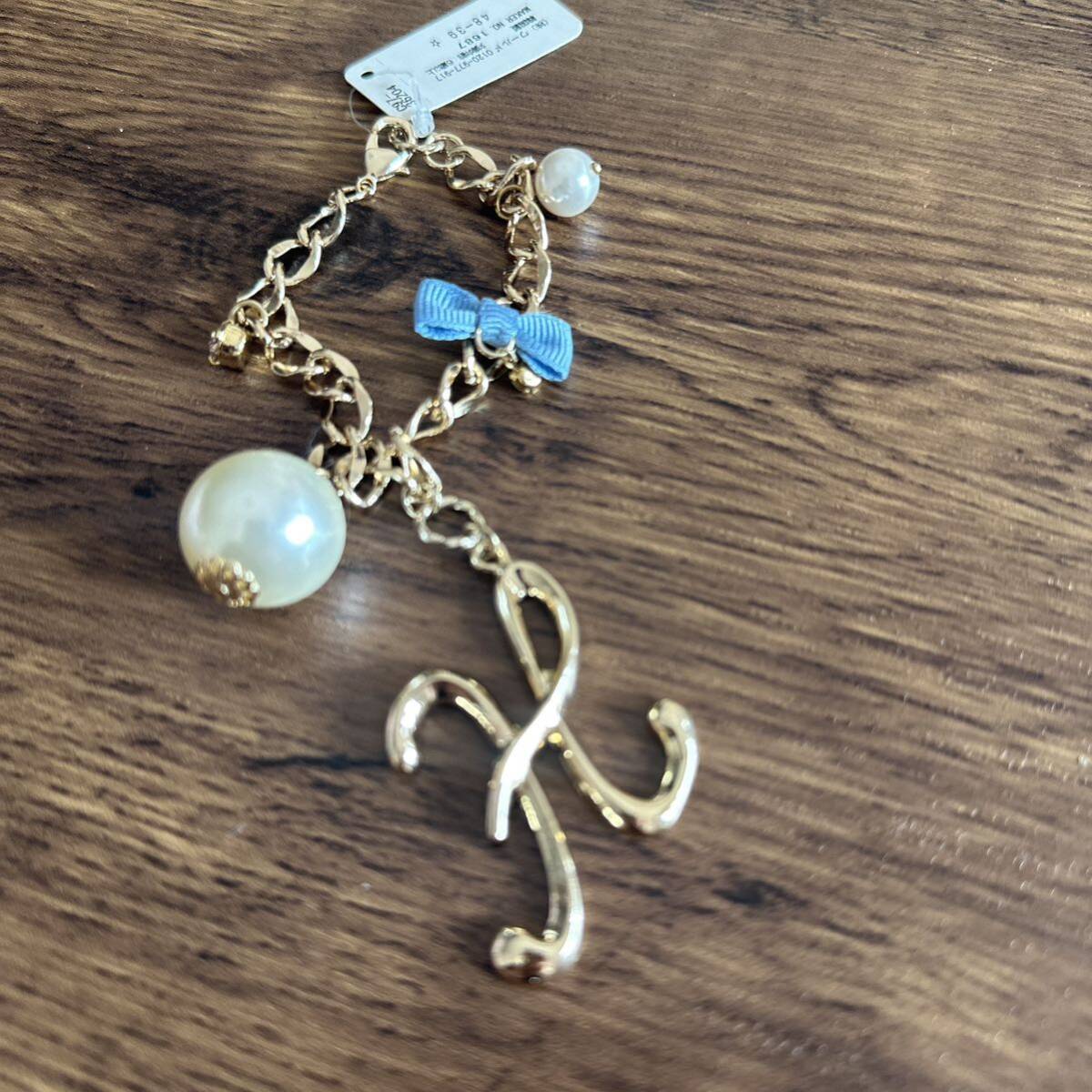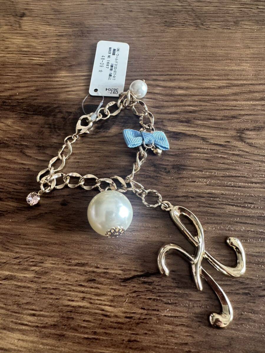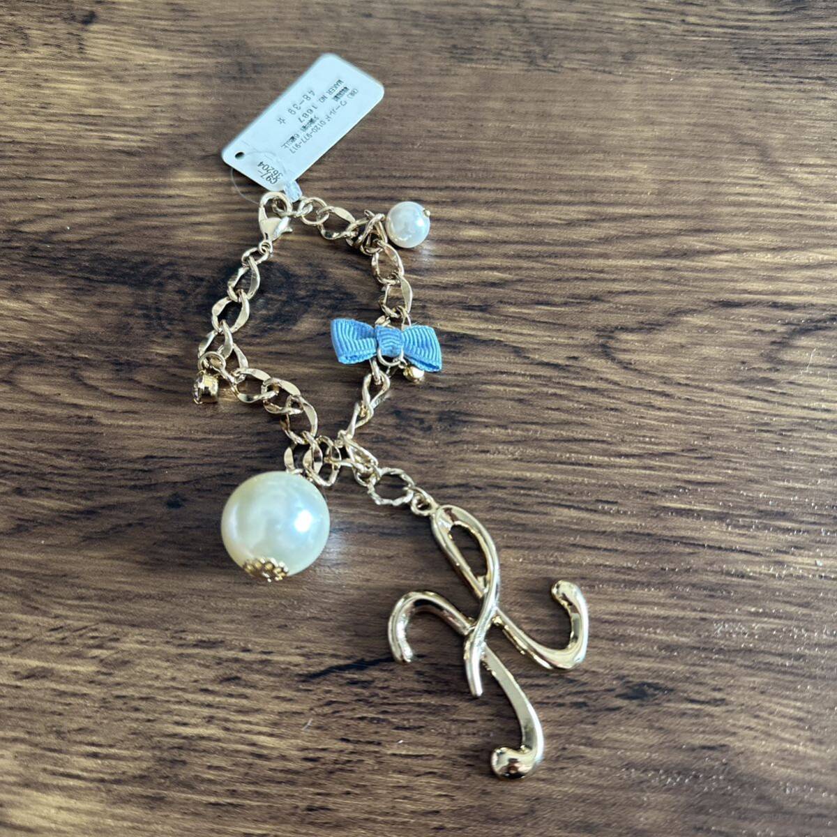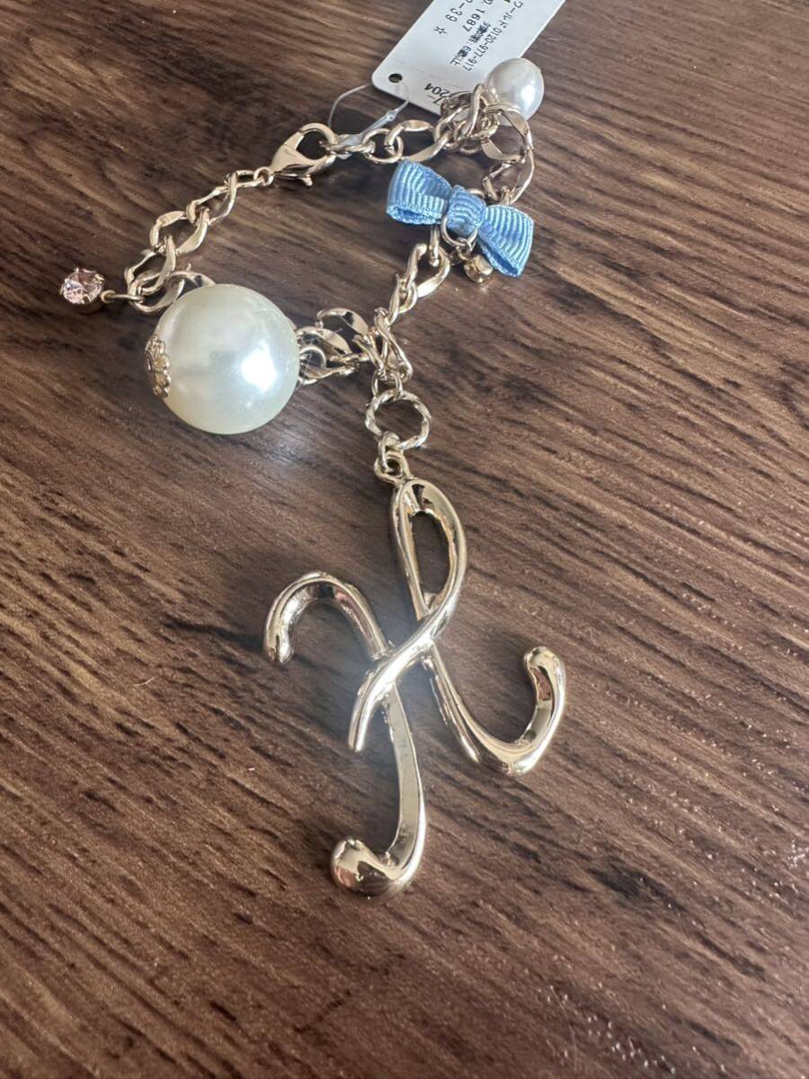 キラッと光るビジューとイニシャルの組み合わせたチェーンで取り外しするタイプのバッグチャーム。