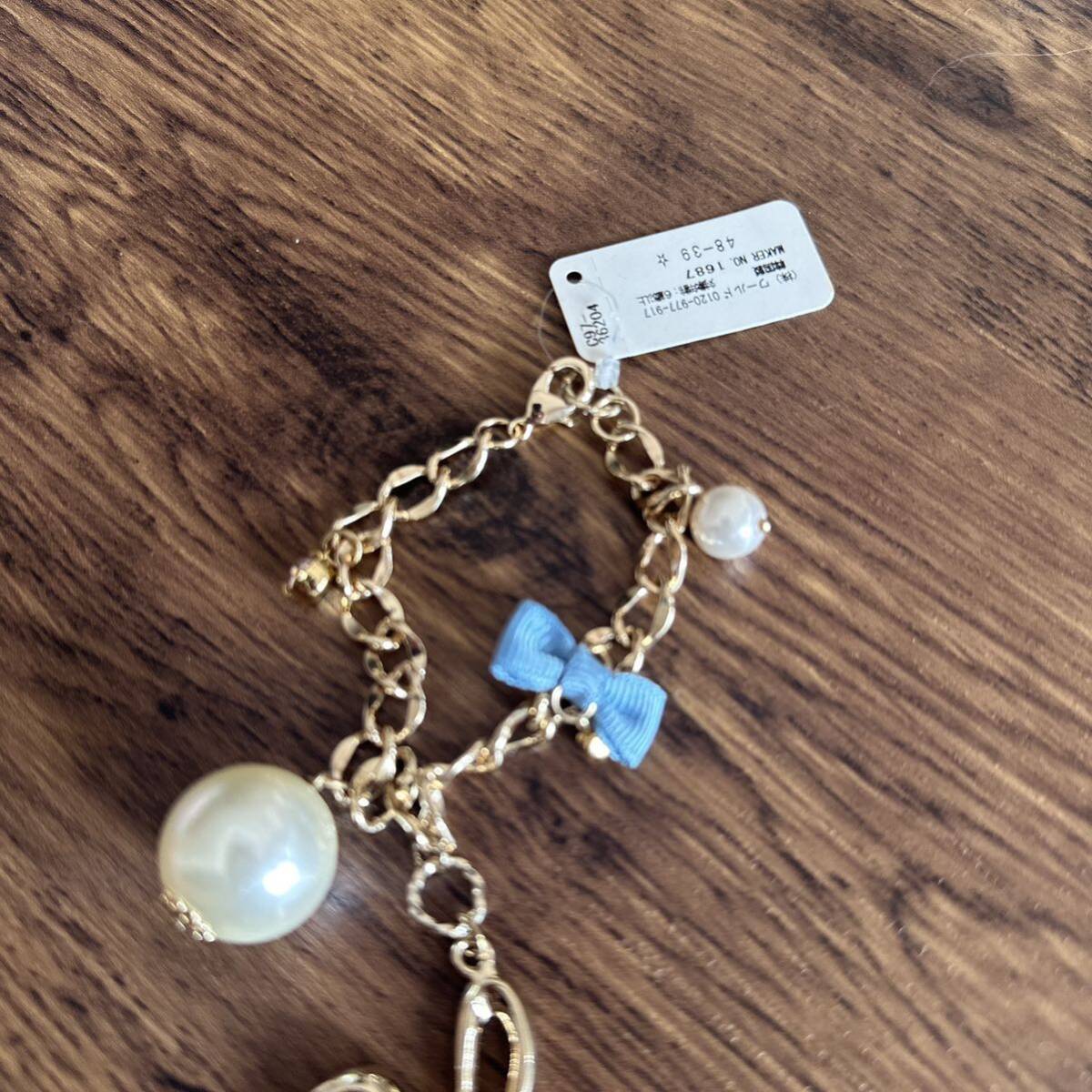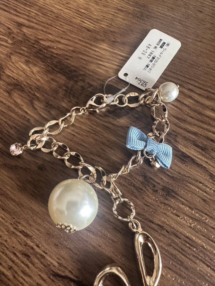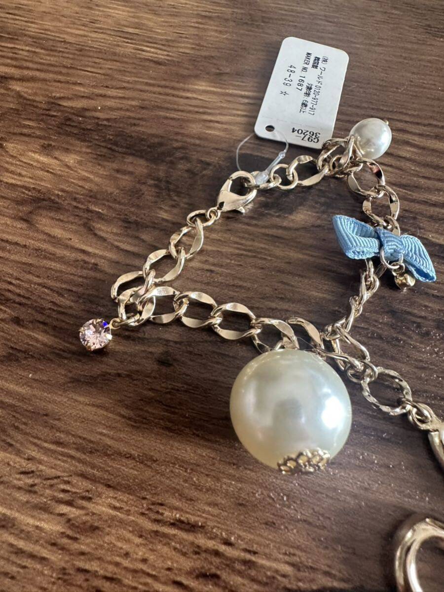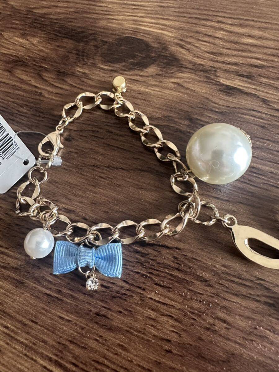 キラッと光るビジューとイニシャルの組み合わせたチェーンで取り外しするタイプのバッグチャーム。