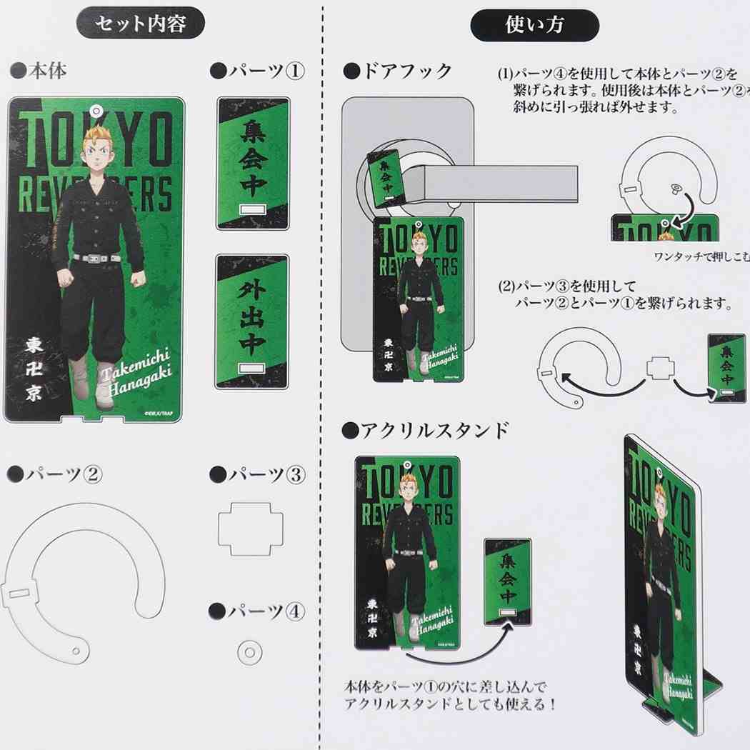 ドアフックとしてもアクスタとしても使える2way仕様 少年マガジンに連載され、アニメ&実写映画も大人気のタイムリープものヤンキー漫画[東京リベンジャーズ]がグッズになって登場こちらは勉強時間や在宅ワークのお供にぴったりな[ドアノブアクリルスタンド]ドアフックとしてもアクスタとしても使える2way仕様です東リベグッズいろいろあるのでお気に入りを揃えてくださいサイズ:約90x165x3mm素材:アクリル[Made in Japan]