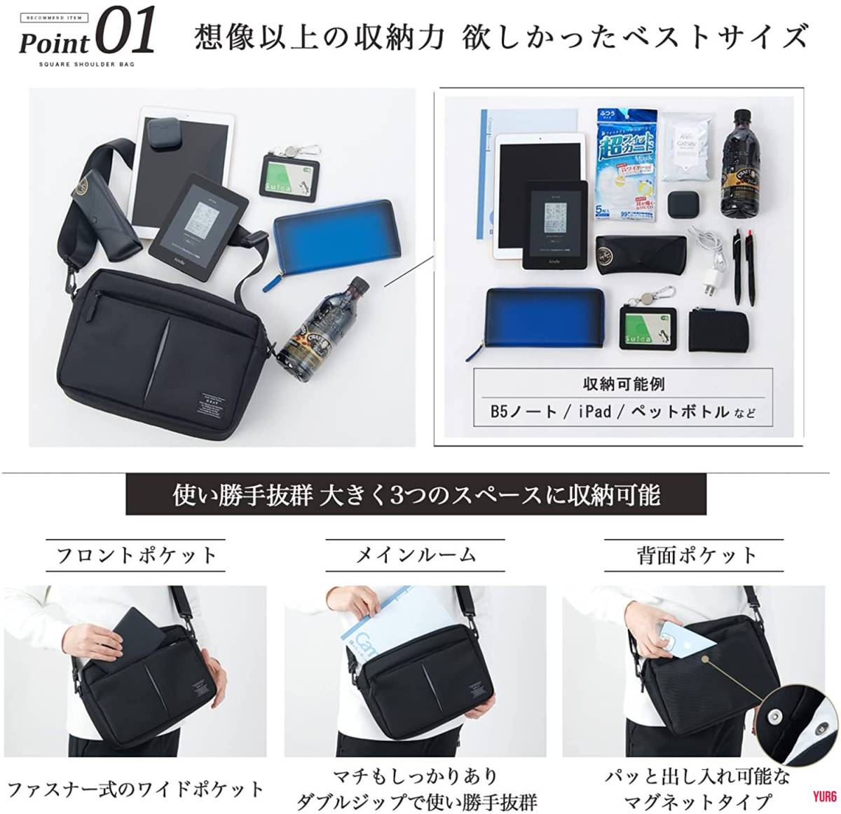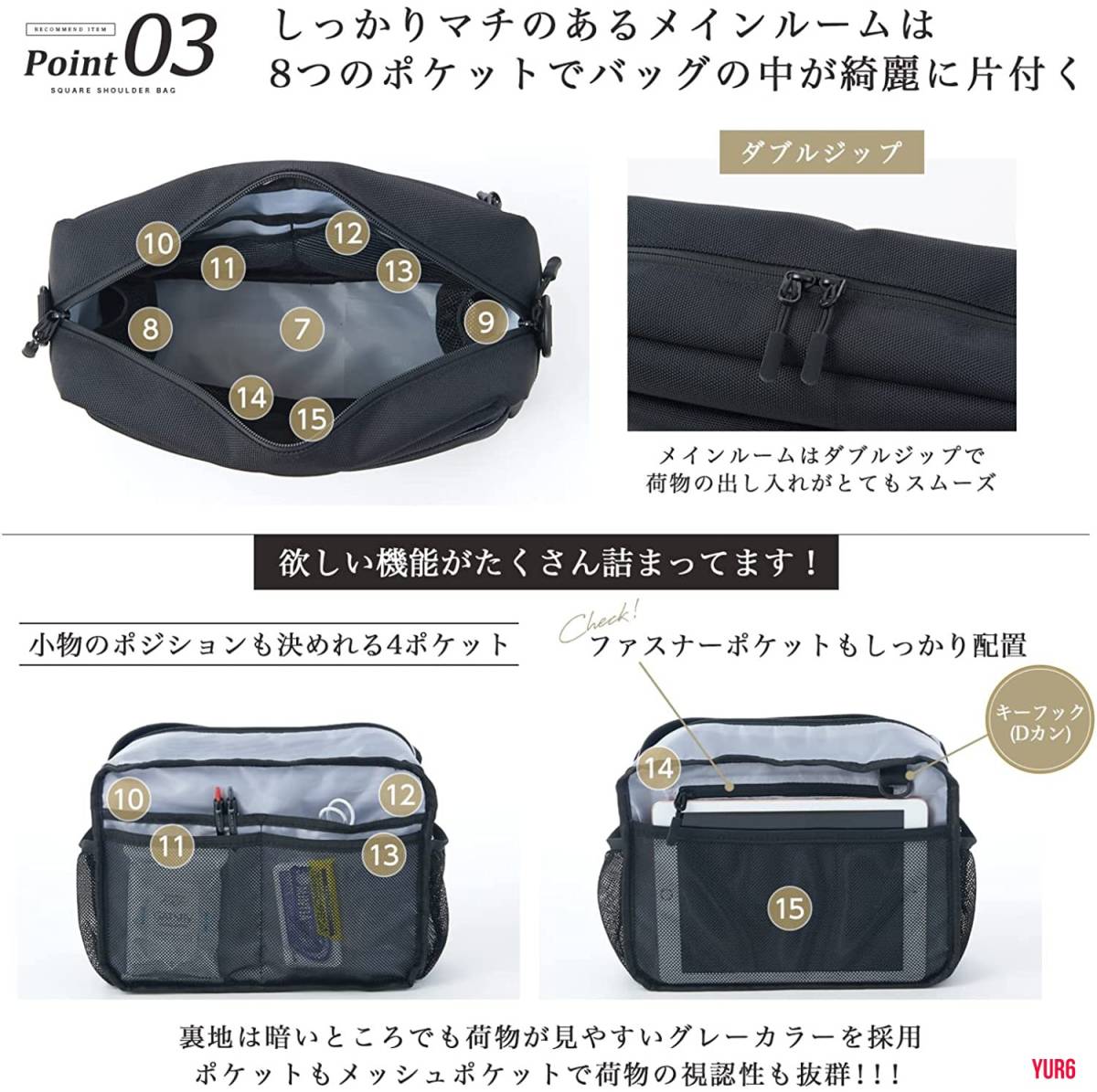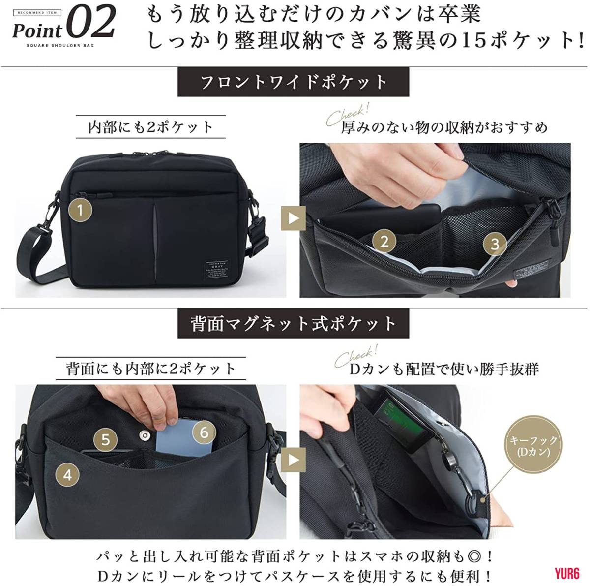 コンパクトながらポケットが多く多機能なスクエア型ショルダーバッグです。