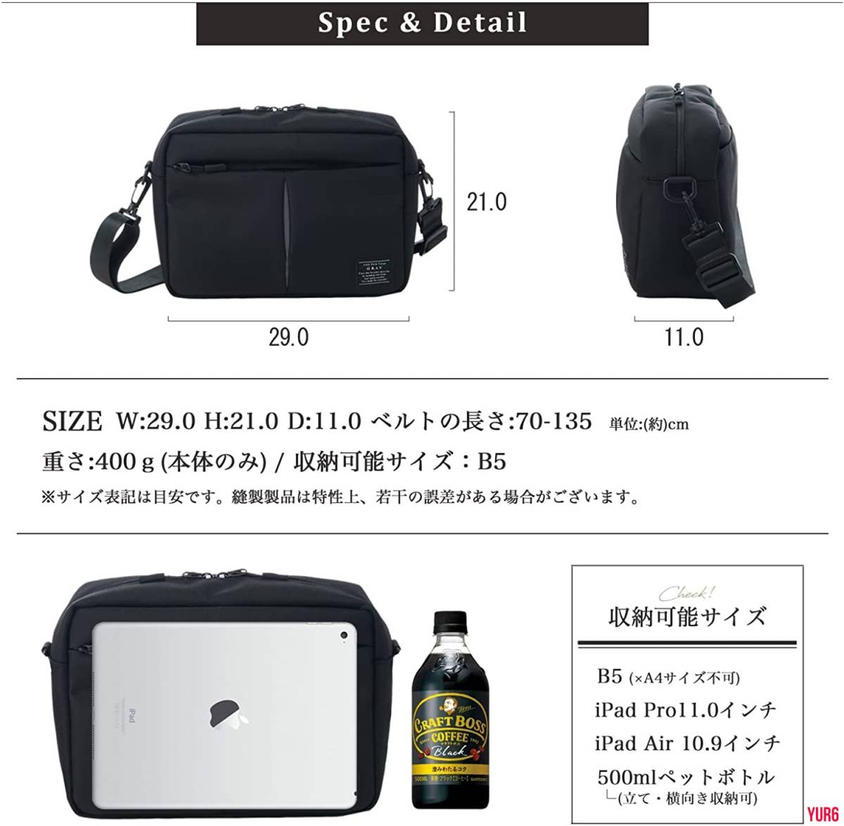 製品のサイズ:縦21cm×横29cm×マチ11cm 重さ:400