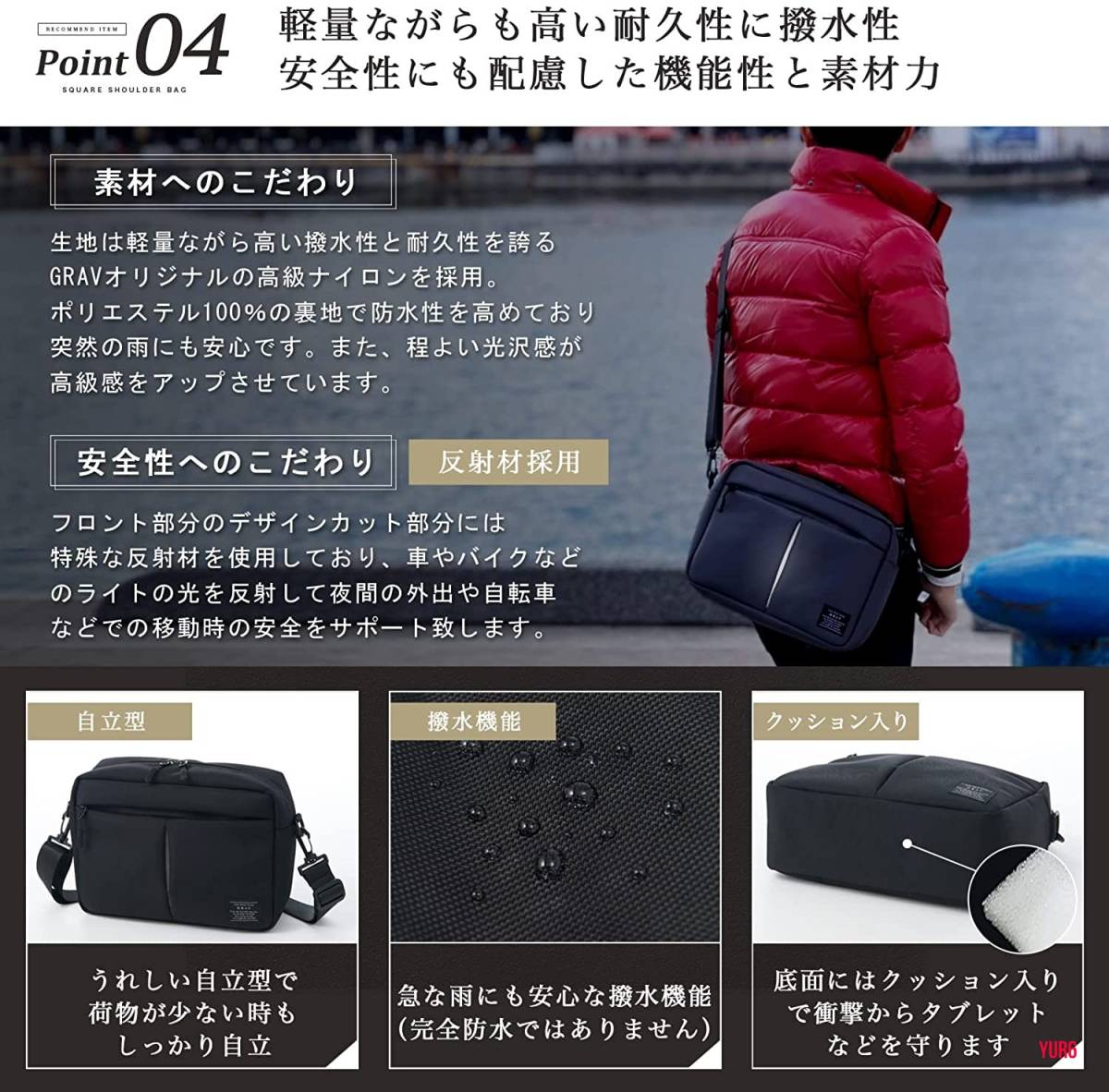 光沢感もあり、御洒落さがあるショルダーバッグに仕上がっています。また、光反射加工を施しており、夜間・雨天時に車や自転車から認知されやすくなり、安全性を高めています。