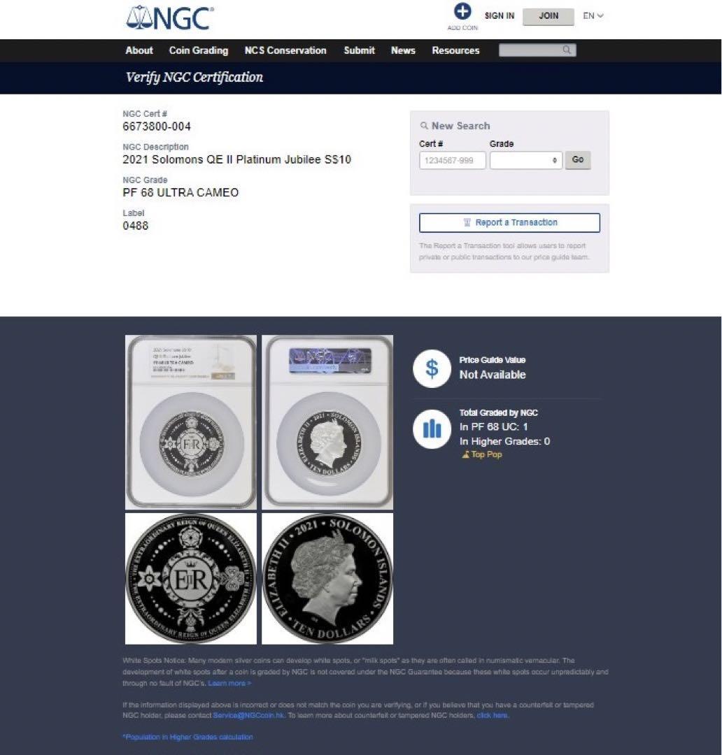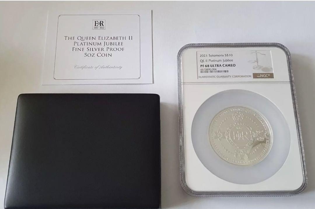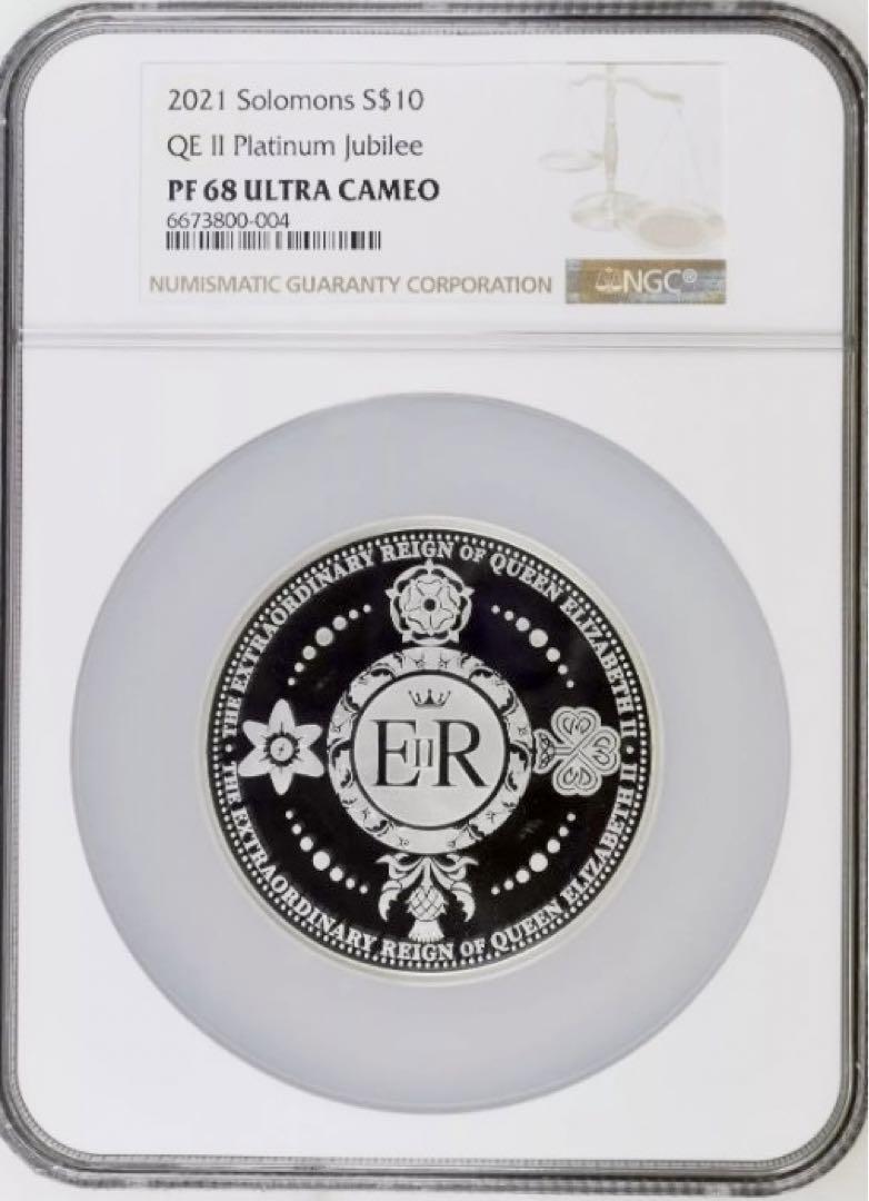 世界で1枚のみ!ソロモン諸島 2021年 10ドル 5オンス銀貨プルーフコイン女王エリザベス2世 プラチナ ジュビリー NGC PF68 ULTRA CAMEO ウルトラカメオ 元箱&COA付