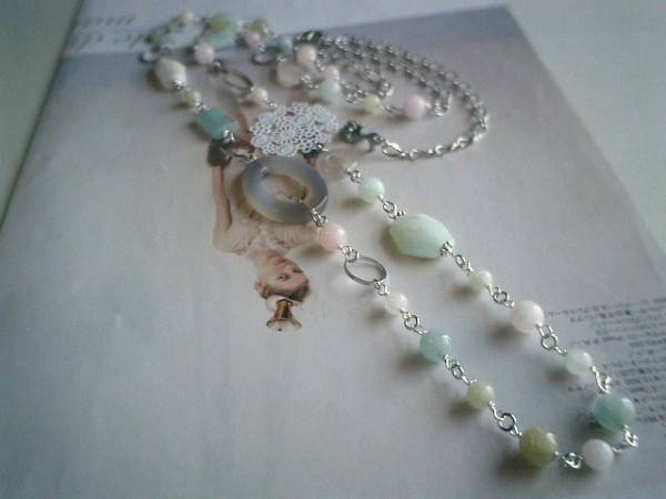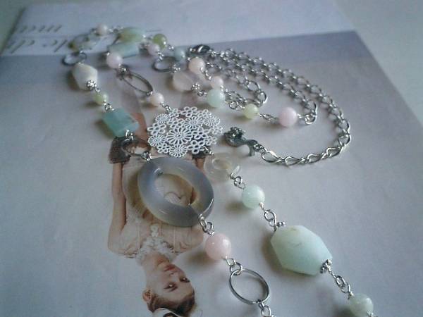セピア色の秋・・シリーズです♪パステルカラーとお花のチャームのキュートなネックレスです♪8ミリから35ミリ位までの丸玉やラフカットやオーバルリング、スクエアカットのブルーオパール、ホワイトオパール、ベルリにお花の透かしチャームを合わせてロマンチックな表情です♪長さは全長110センチ位で調節自由です♪そのまま長くされても2連にされても素敵です♪♪お揃いのブレスレットやピアスも出品しています♪シンプルで飽きのこないいつまでも着けられるデザインを考えて作りました!ハンドメイドをご理解頂いてノークレーム、ノーリターンでお願いします