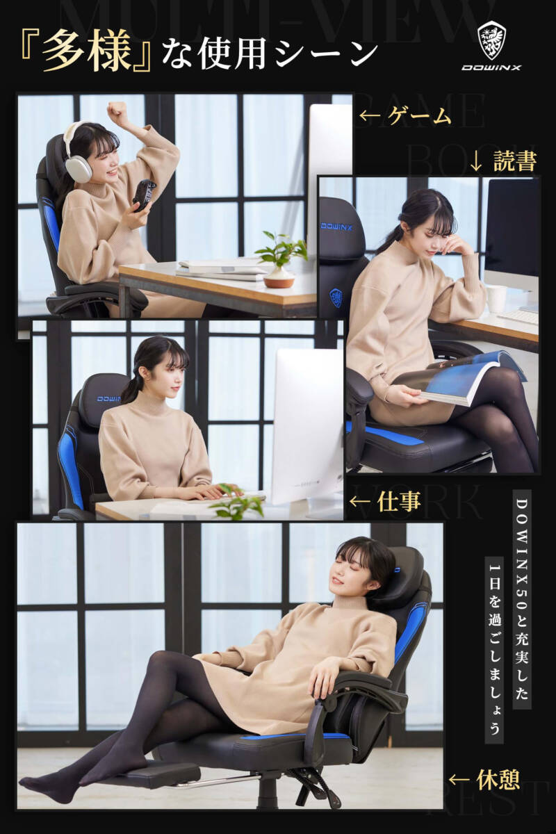 使用用途: ゲーミング、オフィスワーク、リクライニング、ソファ代わりなど多用途