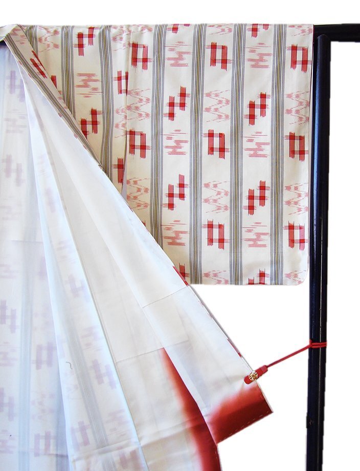 商品説明 | こちらのお品は「袷」ですので10月から5月までお召頂ければと思います。 しなやかな紬は、着易く動きも軽く、着くずれしない腰の強さを併せ持った お洒落着としていつでもどこへでもお気軽にお愉しみ頂けご愛用頂けるお品です。 とてもしなやかなシャリやハリ感ある肌触りも心地よいさらりとした柔らかな紬地は、 白に近い生成り色地に墨、蒸栗色の縞に赤色の絣柄の織柄、 八掛はエンジ色(正絹)、幅広い年代の方にお召し頂けます。 |