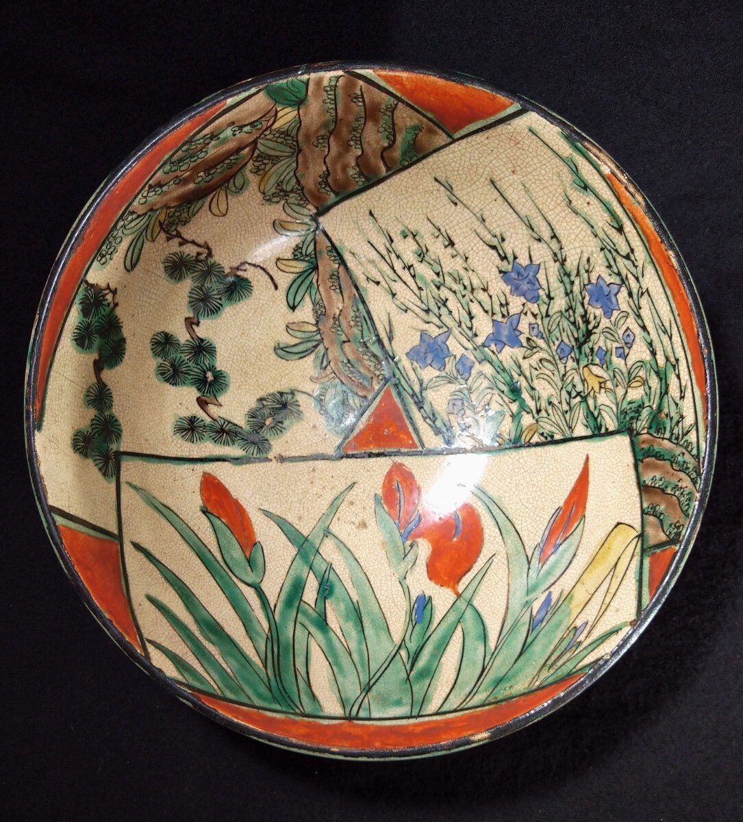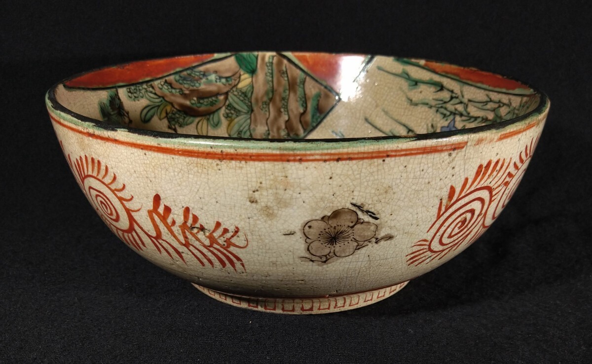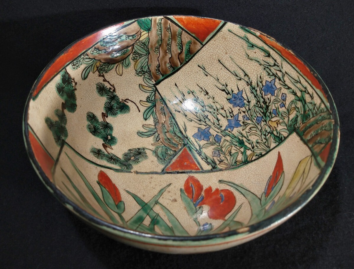 松や花々が描かれた美しい深鉢でございます。実寸よりも大きい印象を受けるお品でございます。素人採寸で申し訳ございませんが、径22.6cm、高さ9.4cmでございます。