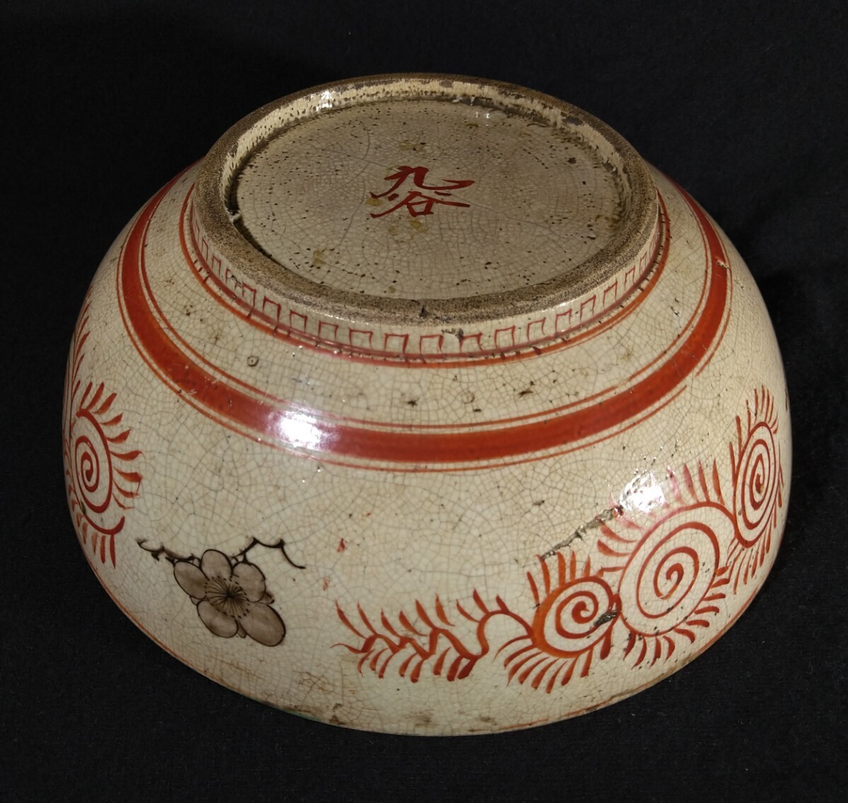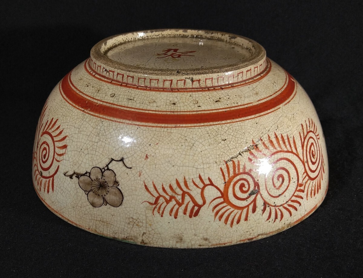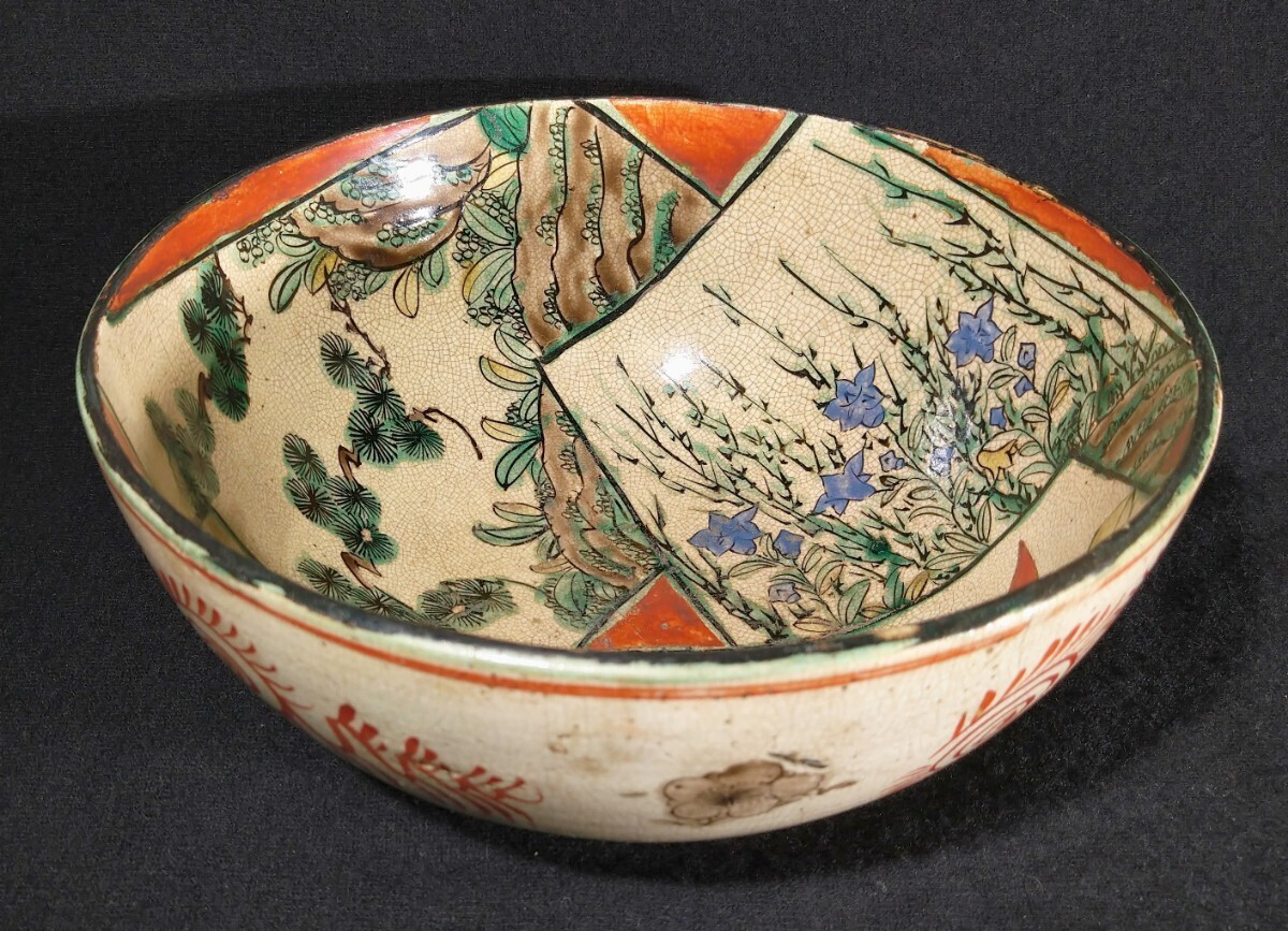 松や花々が描かれた美しい深鉢でございます。実寸よりも大きい印象を受けるお品でございます。素人採寸で申し訳ございませんが、径22.6cm、高さ9.4cmでございます。
