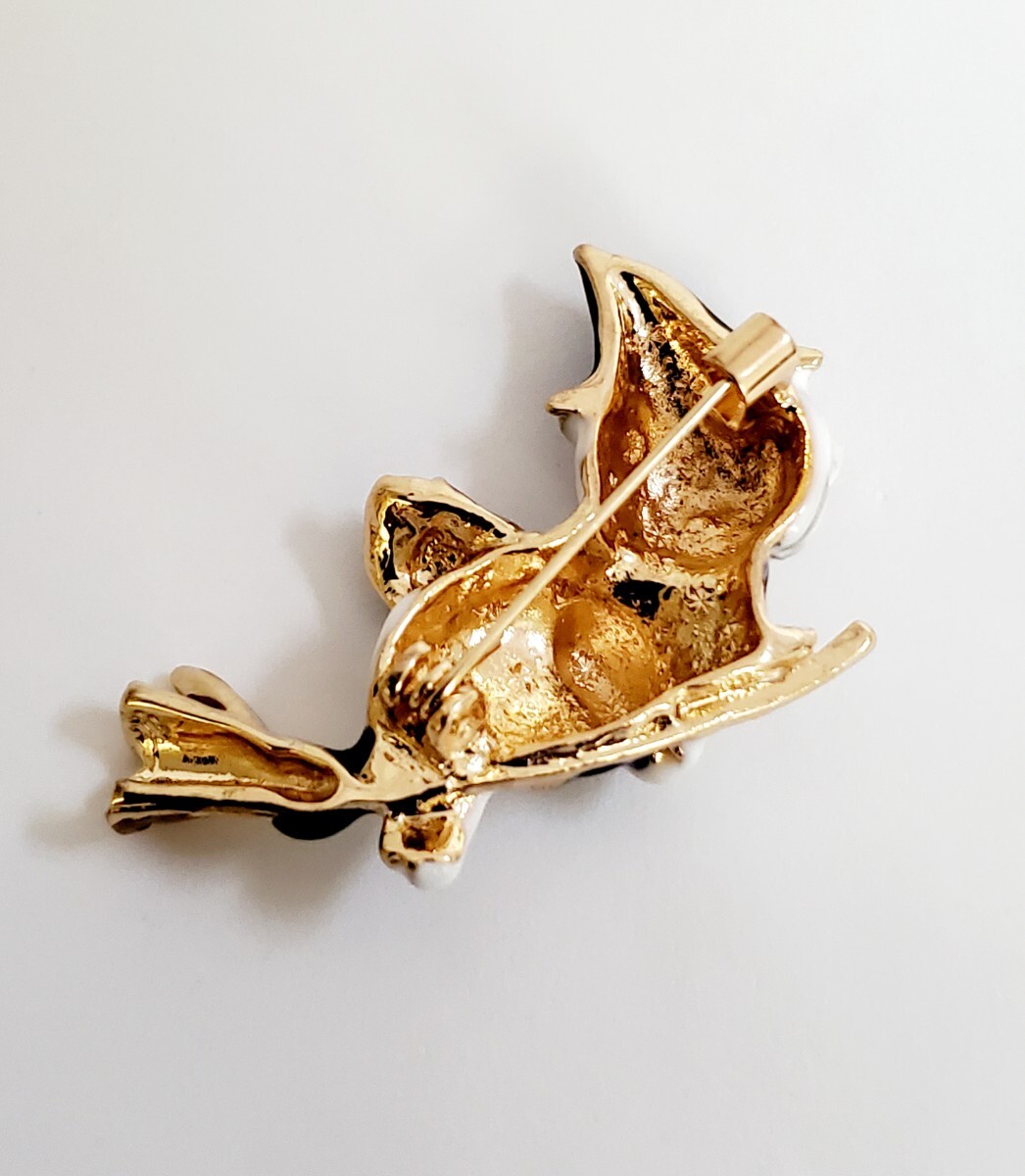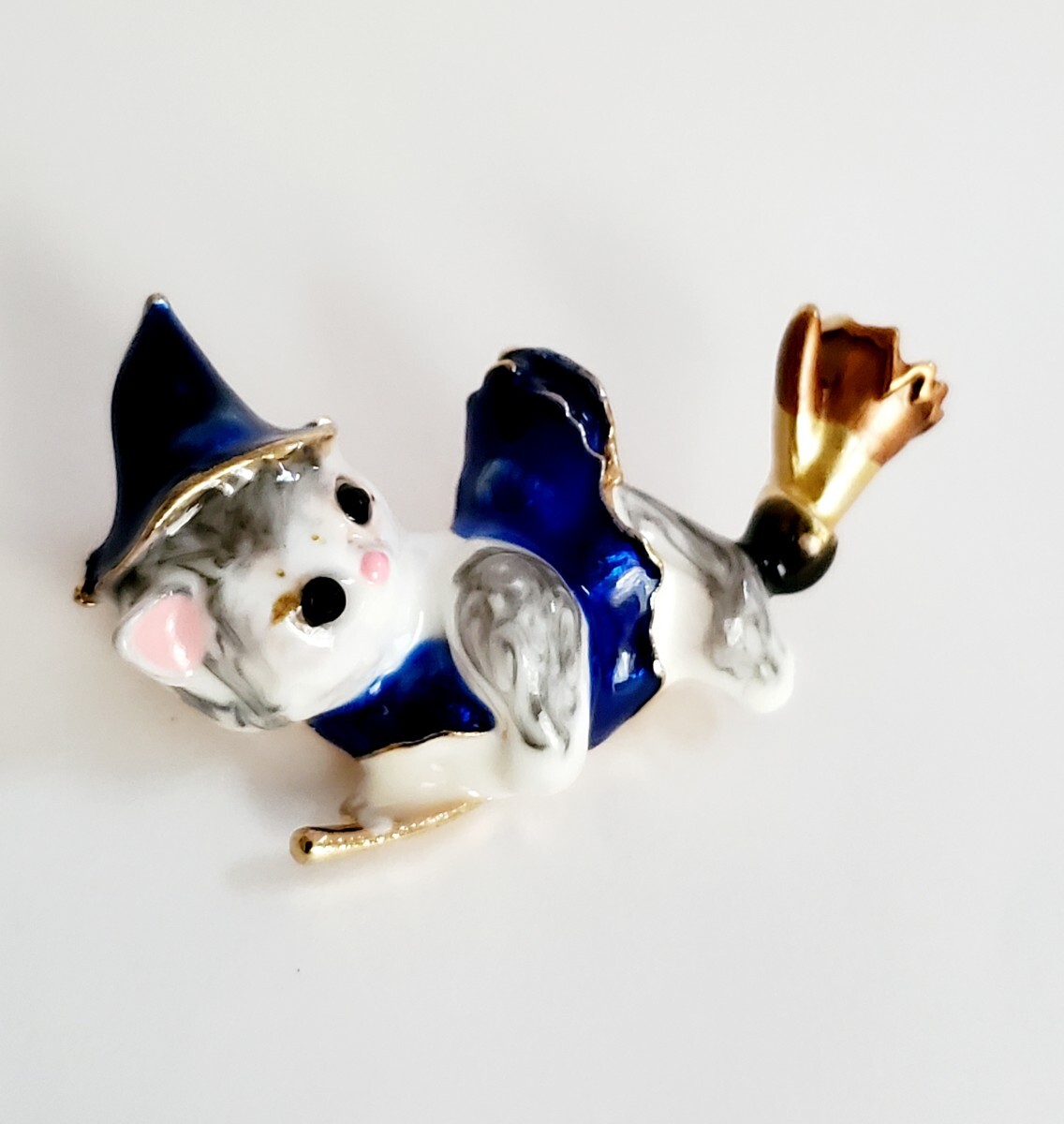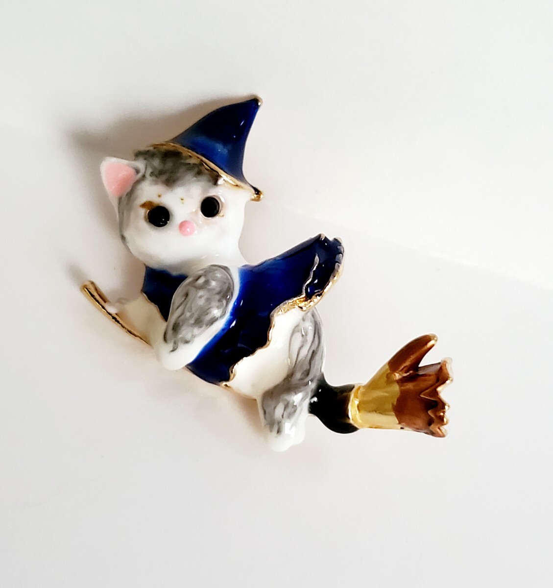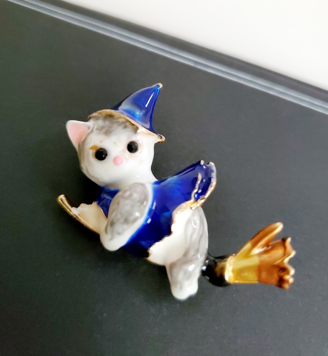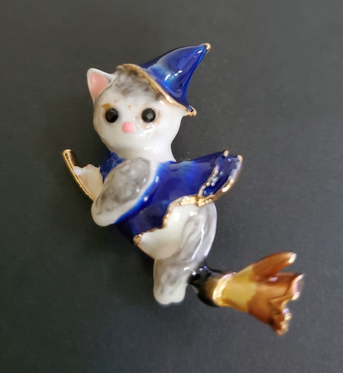 ホウキに載った魔女の猫のブローチです。