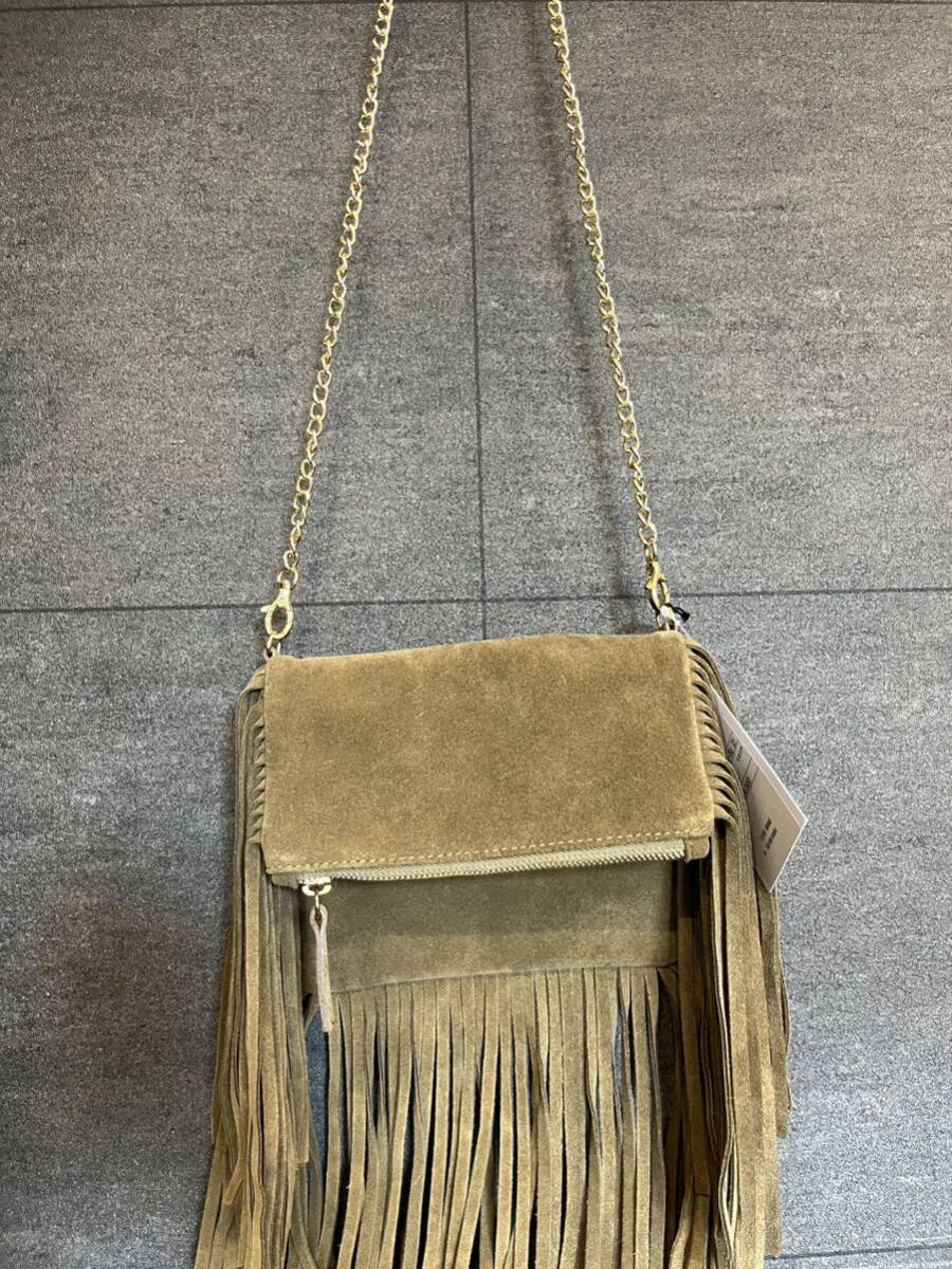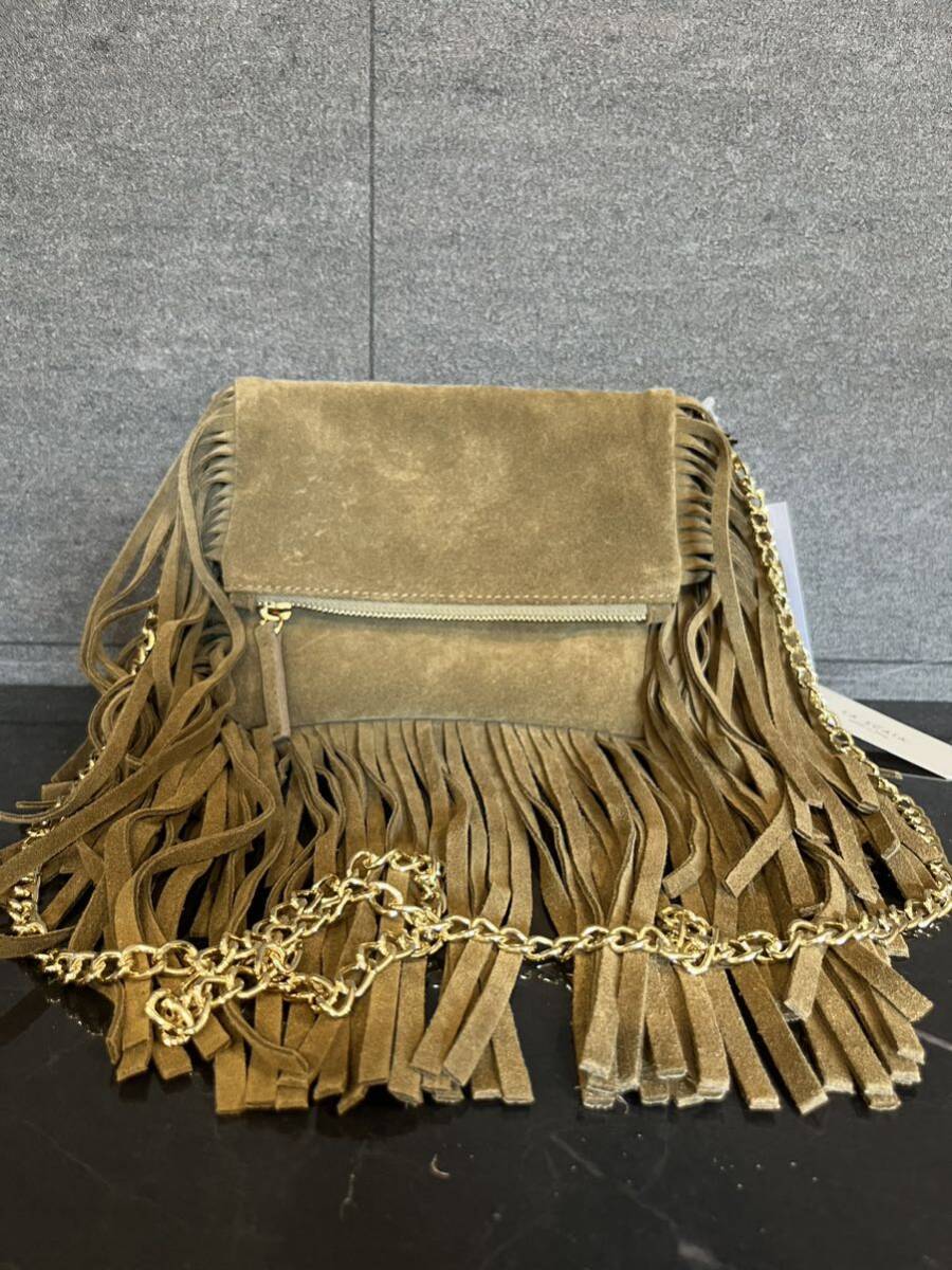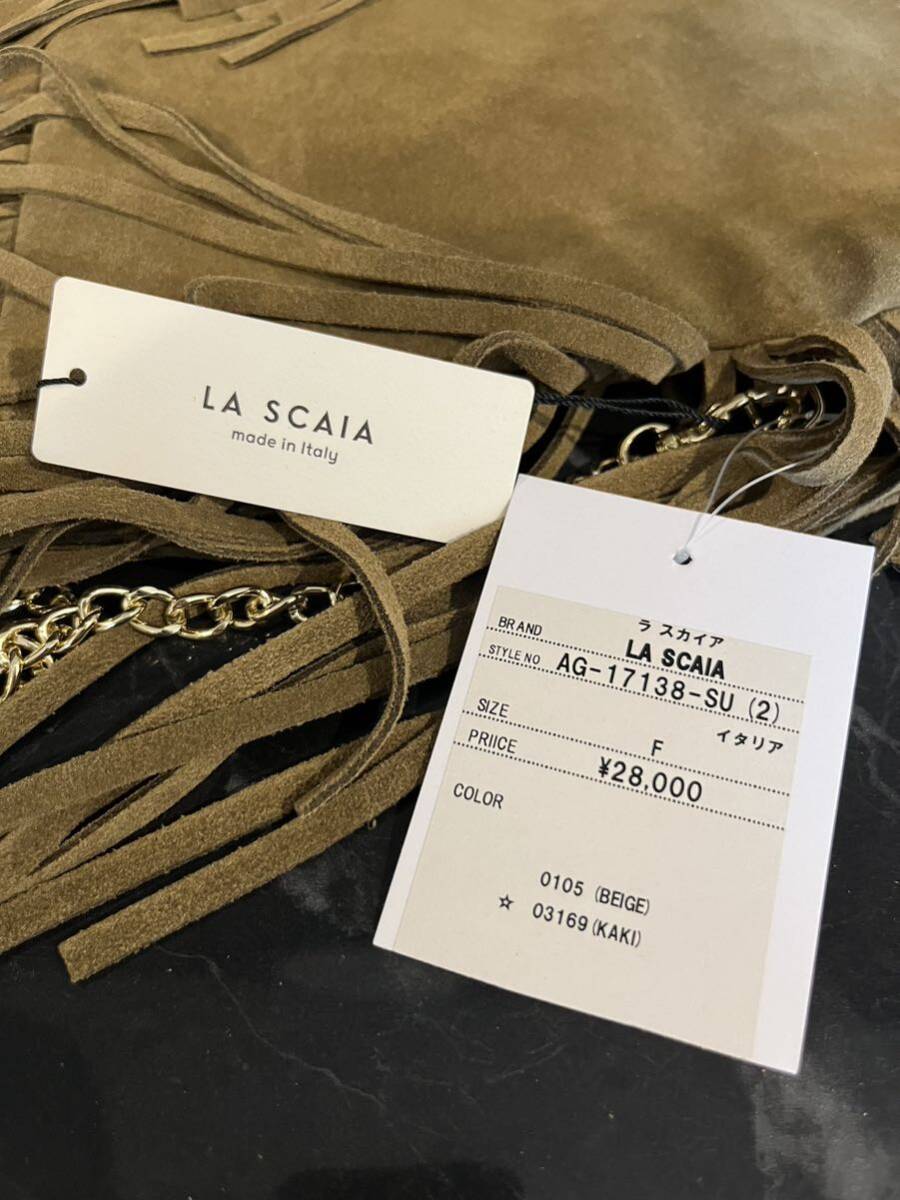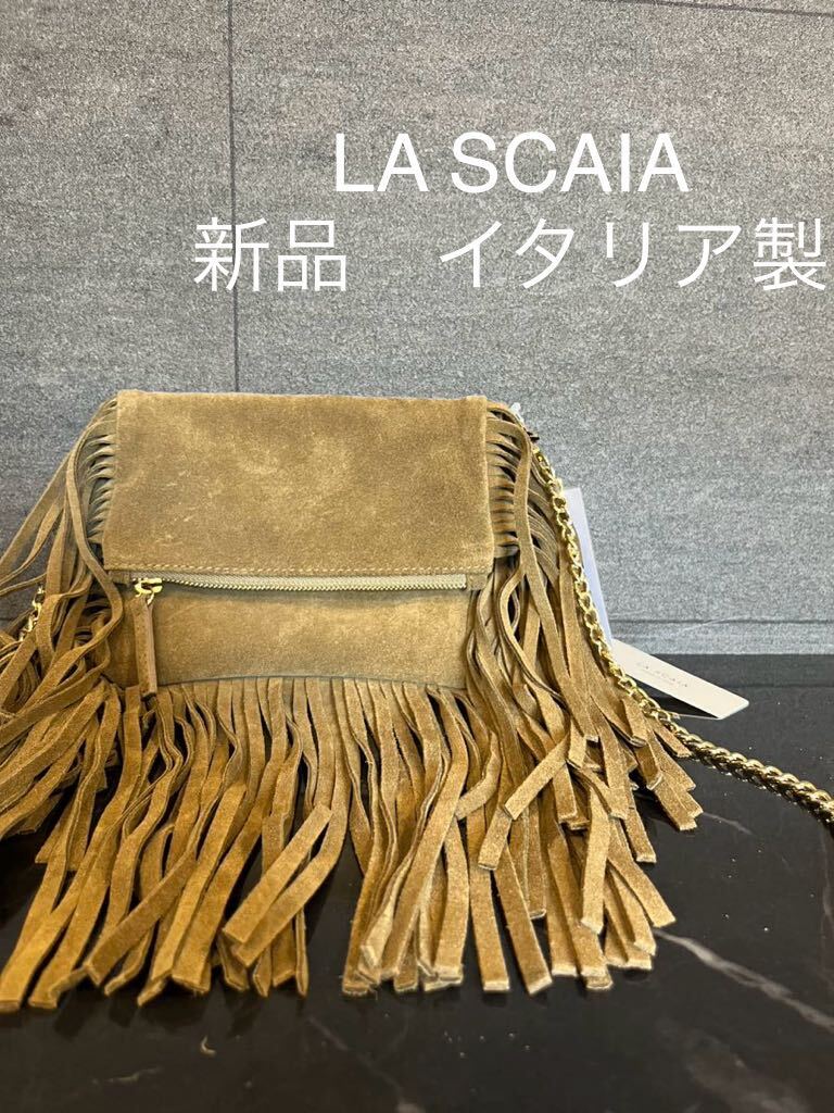 新品 イタリア製 LA SCAIA ラ スカイア レザーバッグ スエード ショルダーバッグ フリンジ ゴールドチェーン 肩掛け 定価30800 玉mc2931