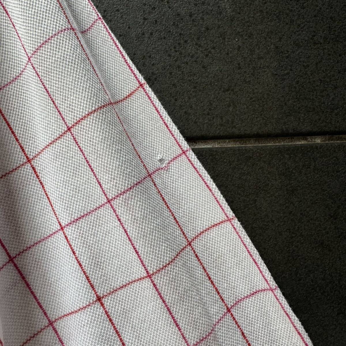 カラーはホワイト系にピンクの格子柄、素材はおそらくコットンになります。
