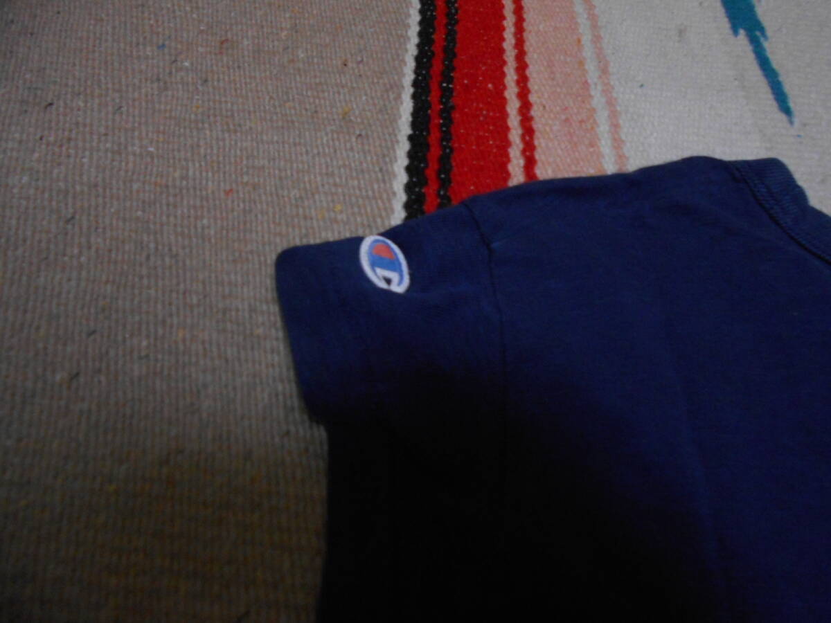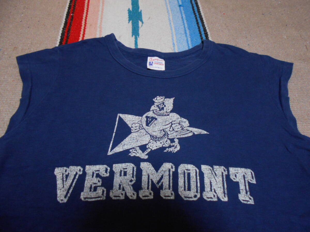 チャンピオン ランタグ付き アスレティック特有のビンテージコットン100%素材感、風合いあるネイビーアッシュの発色、クラックの入った旧塗料使用のVERMONTロゴとエンブレム、アームピットのベンチレーション確保ベリーショートスリーブ、巻き付けネックリブ、アームの 「C」 エンブレム   等等... 細部まで極めて良いテイスト、着心地が良い上とても丈夫