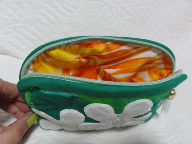 ハワイアンキルト★プルメリアのポーチ グリーン ハンドメイド
