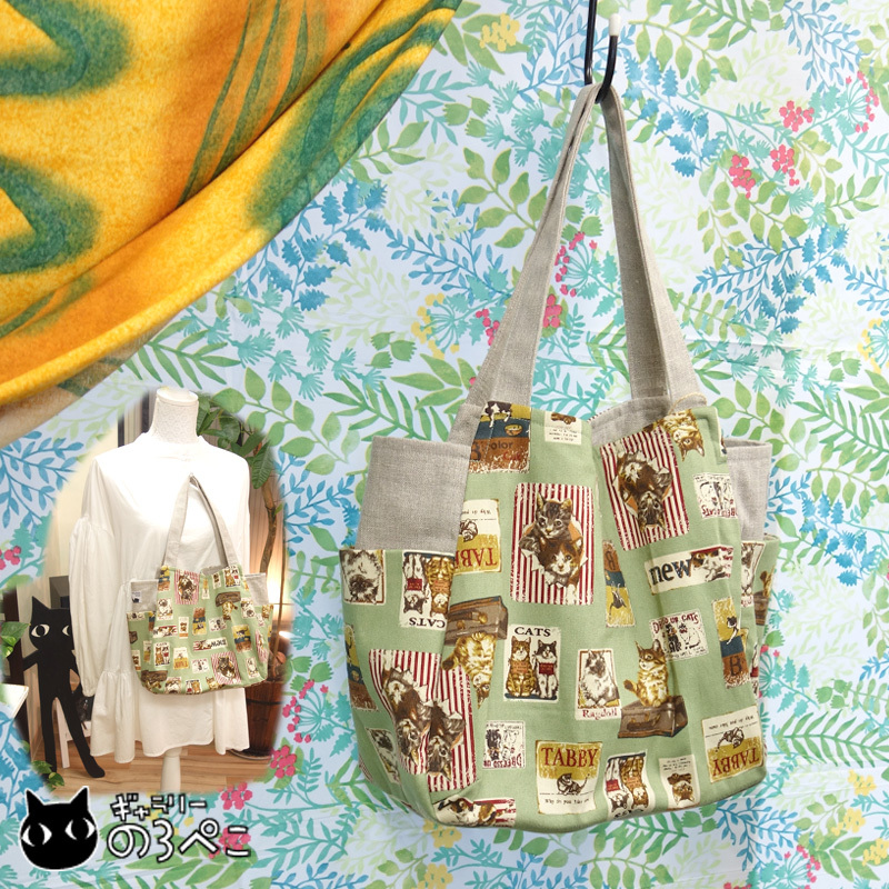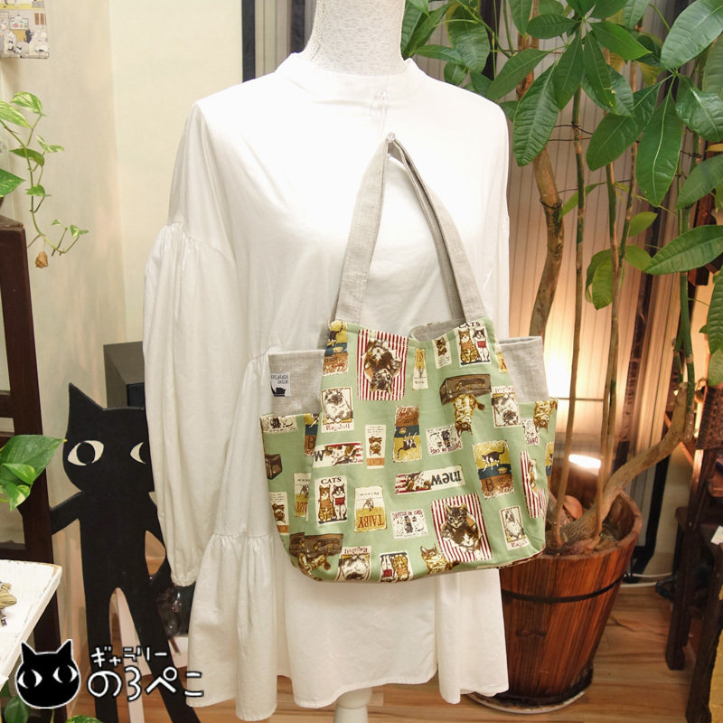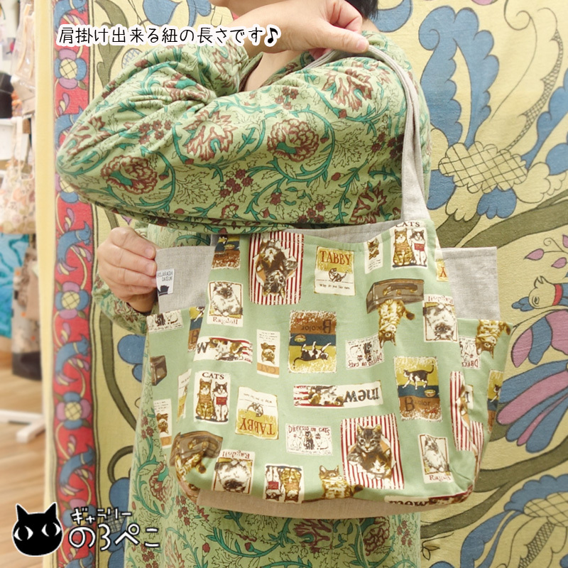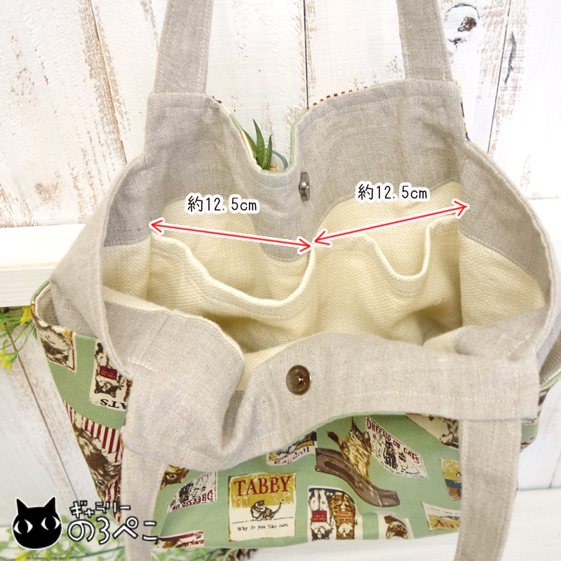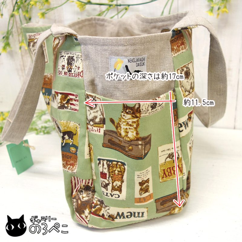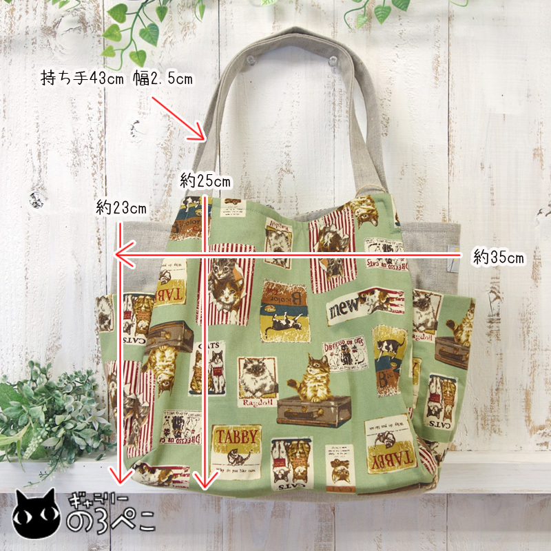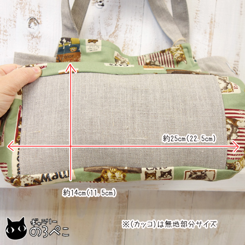 外側の猫ちゃん生地はしっかりとした厚みがあるモスグリーンのコットンリネンキャンバス、無地部分は丈夫な無地生成りリネンです。入れ口にはマグネットボタンを付けています。
