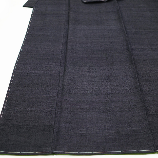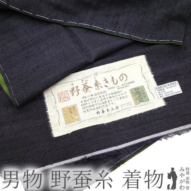 【新古品】 男物 紬 着物 正絹 野蚕糸 ムガシルク タッサー 野蚕工房 墨黒色 無地 インド 野蚕つむぎ カジュアル ガード加工済み 袷 春 秋 冬 未使用 仕立て上がり 身丈142 裄丈70 身長170cm前後 Mサイズ みやがわ sbs14361