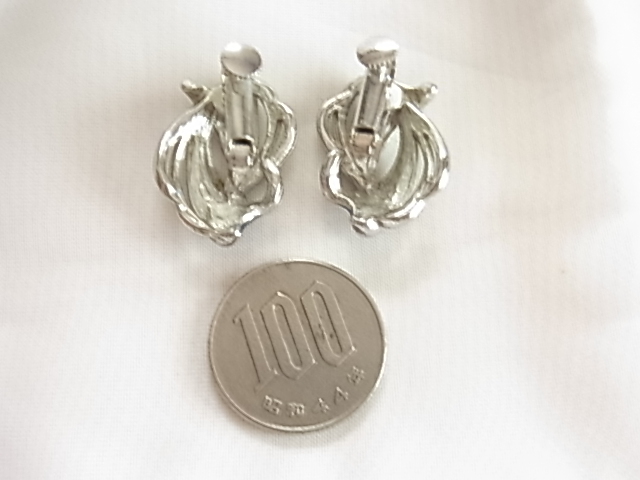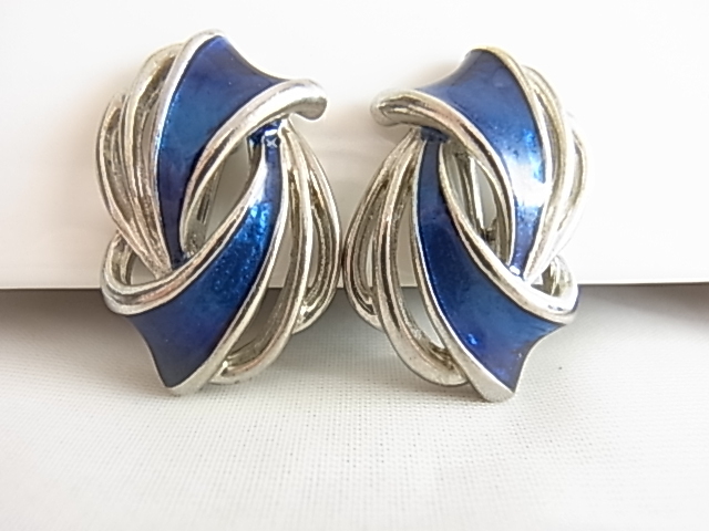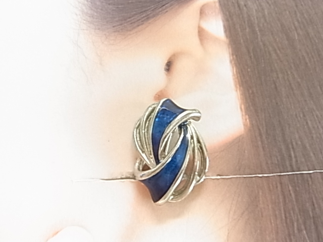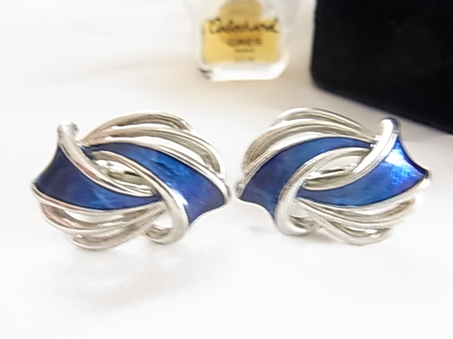 ビンテージ/ヴィンテージ 綺麗なサファイアいブルートーンとシルバートンの2トーン 個性的なデザインの印象的なレトロなイヤリング■