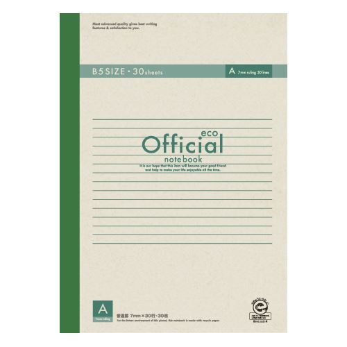 セミB5判:横179×縦252mm。中紙:6A3FEのみ古紙パルプ配合再生紙使用。印刷:大豆油インク(SOY。INK)。サイズ:セミB5判。30行。枚数:30枚 |