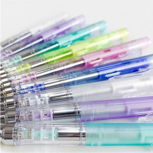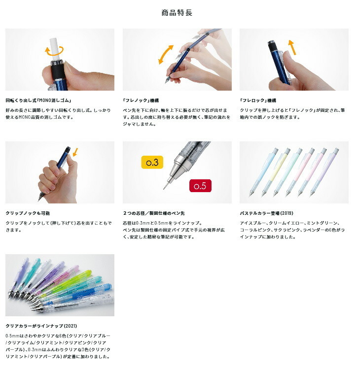 軸を上下に振って芯を出す「フレノック機構」とクリップを押し上げると「フレノック」が固定される「フレロック」機能も付いて、高品質・高精度な「書く」と「消す」を実現しています。
