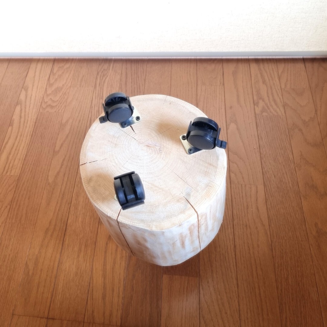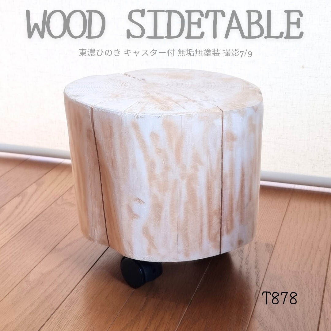 樹齢約90年の東濃ひのきの原木テーブル。ストッパー付きキャスターでらくらく移動。サイドテーブルやディスプレイ台など用途は多数。